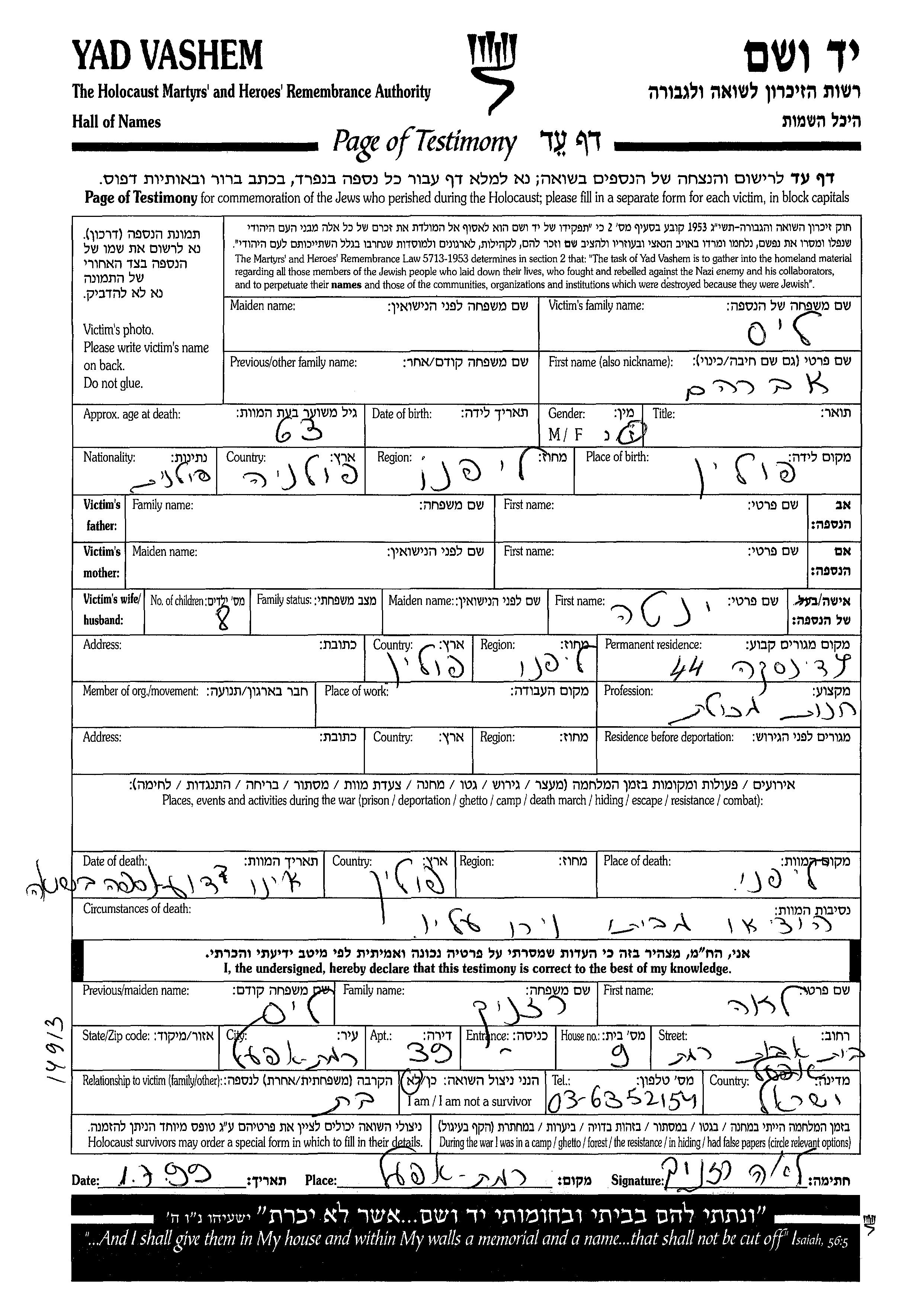 Lis Avraham Lipno, Poland Page of Testimony