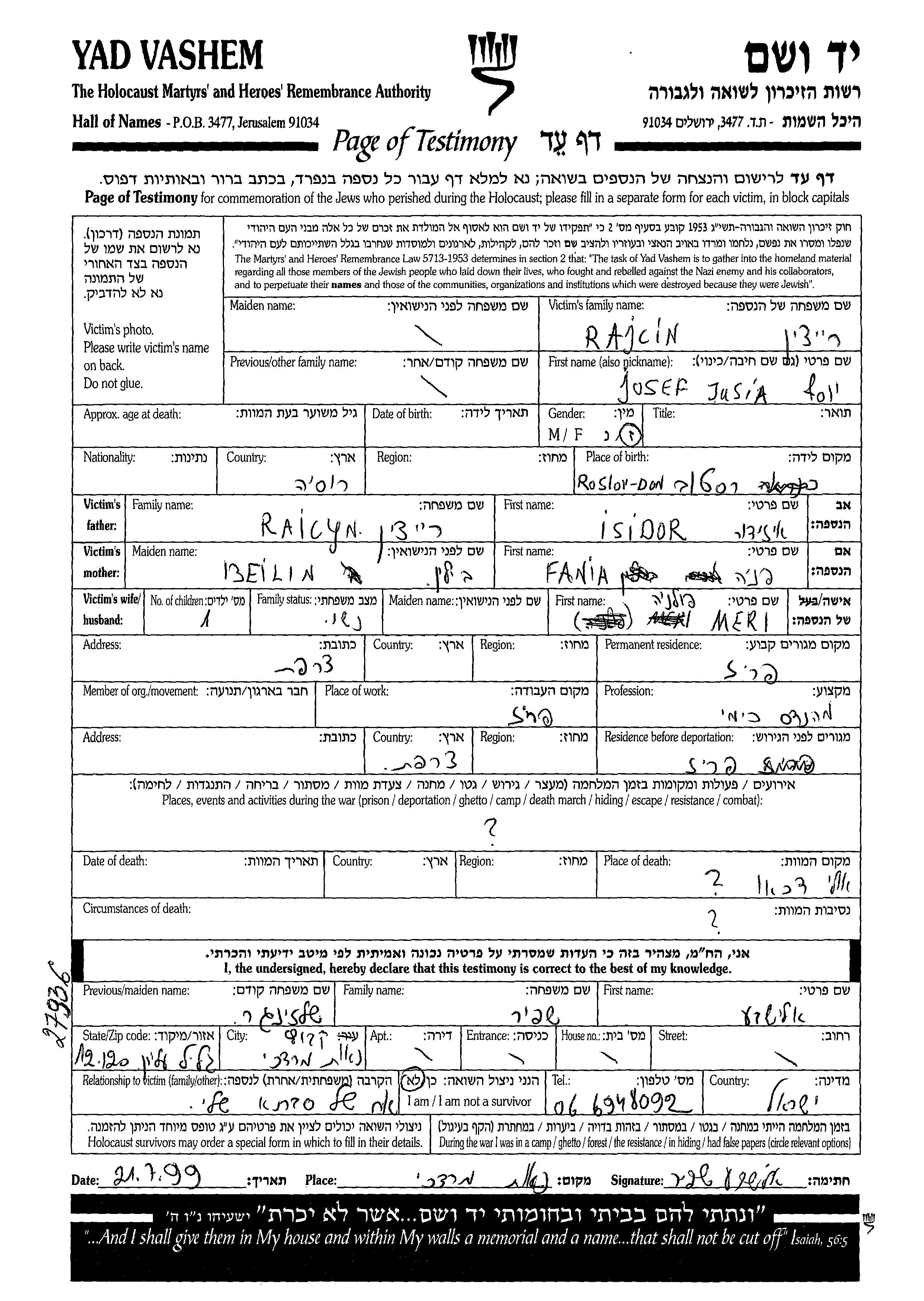 Rajcin Josef Jusia Paris, France Page of Testimony