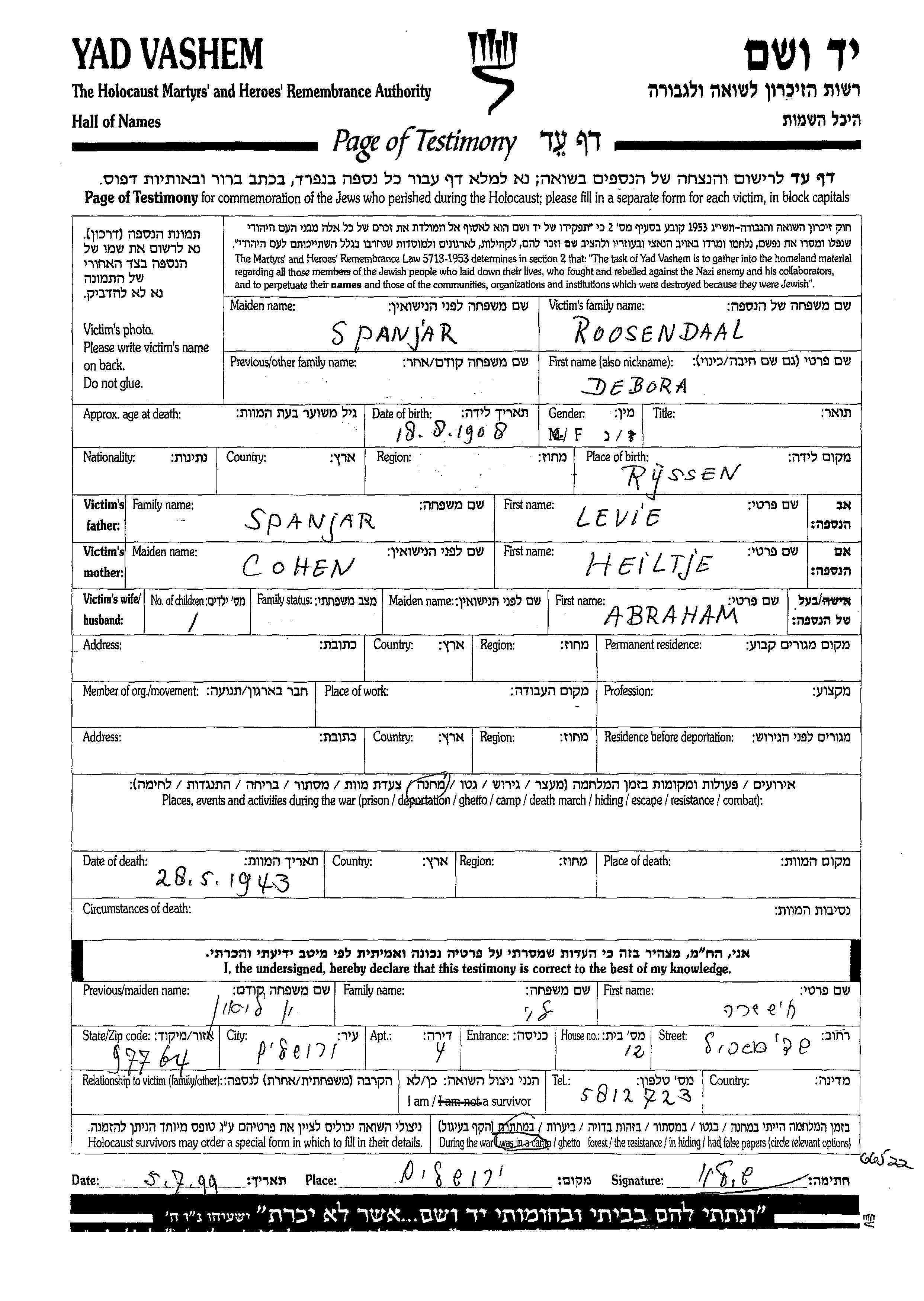 Debora Roosendaal nee Spanjar was born in Rijssen, The Netherlands, 1908 to Levie and Heiltje. She was married to Abraham. Debora was murdered in the Shoah. Place of death: unknown, 1943.