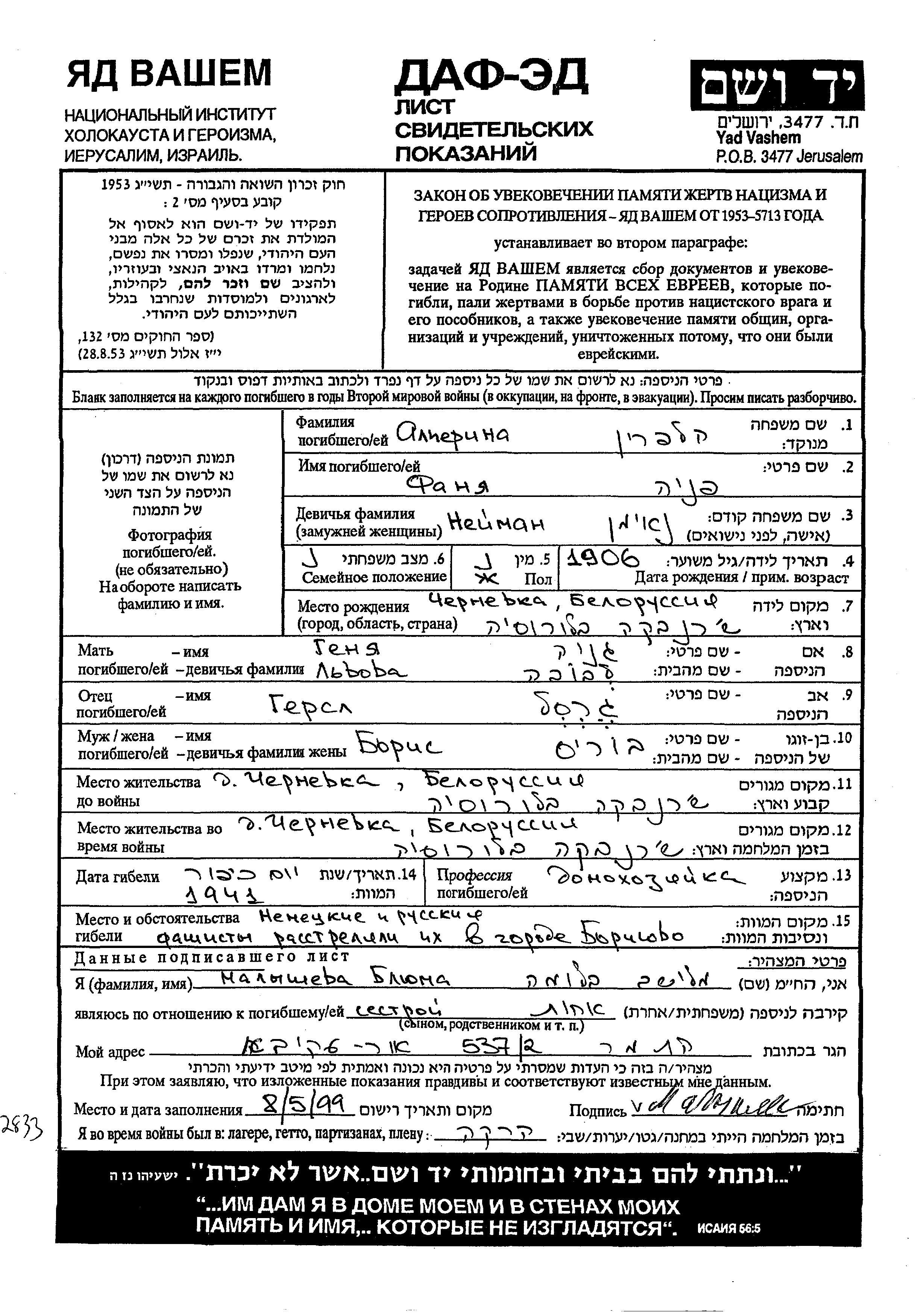 Fanya Alperin nee Neiman was born in Chernevka, Belorussia (USSR), 1906 to Gersl and Genya. She was a housewife and married to Boris. Prior to WWII she lived in Chernevka, Belorussia (USSR). During the war she was in Chernevka, Belorussia (USSR). Fanya was murdered in the Shoah. Place of death: Borisov, Belorussia (USSR), 1941.