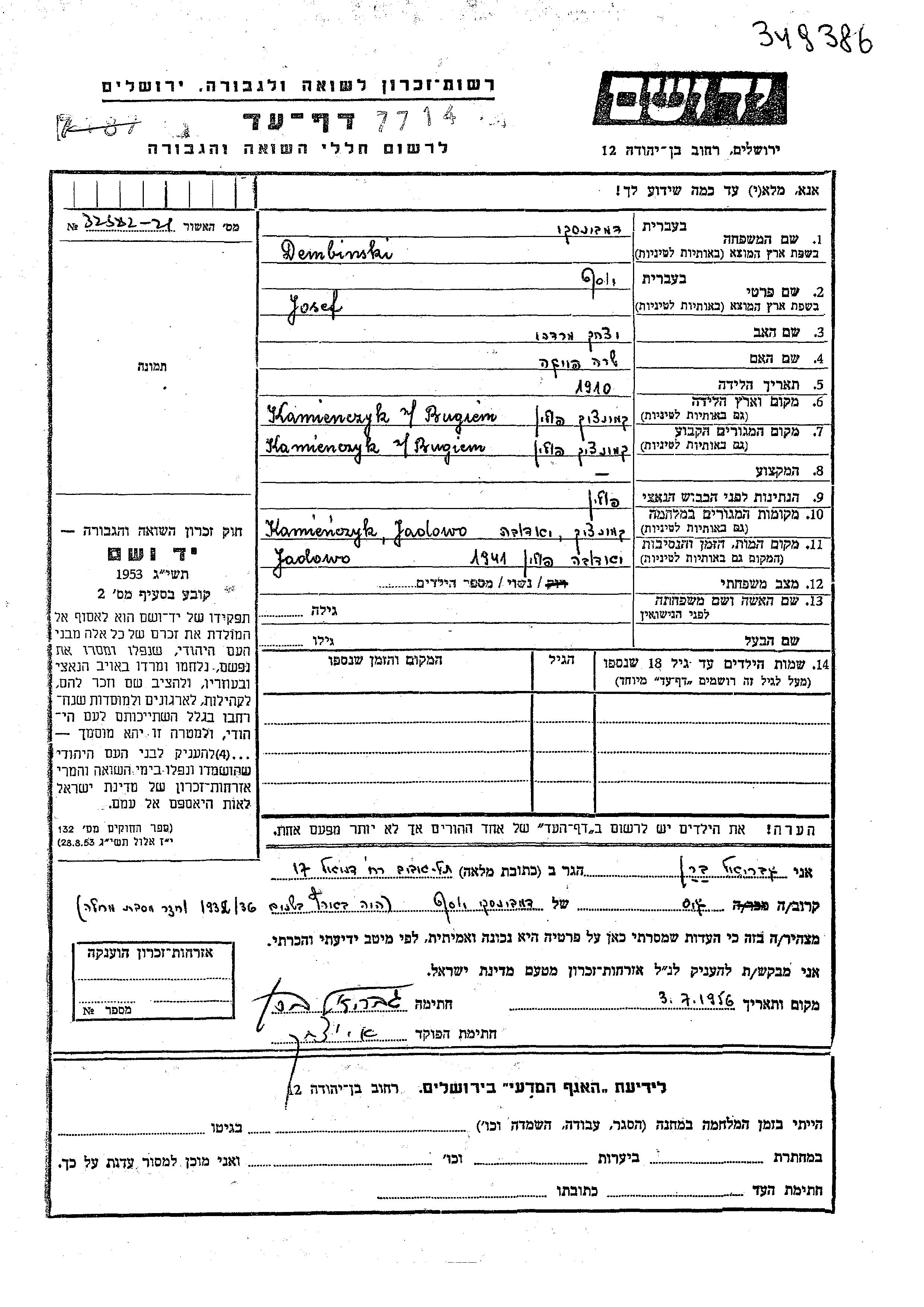 Josef Dembinski was born in KAMIENCZYK NAD BUGIEM, Poland, 1910 to Yitzkhak Mordekhai and Sara Feiga. He was married. Prior to WWII he lived in KAMIENCZYK NAD BUGIEM, Poland. During the war he was in Jadowo, Poland. Josef was murdered in the Shoah. Place of death: Jadowo, Poland, 1941.