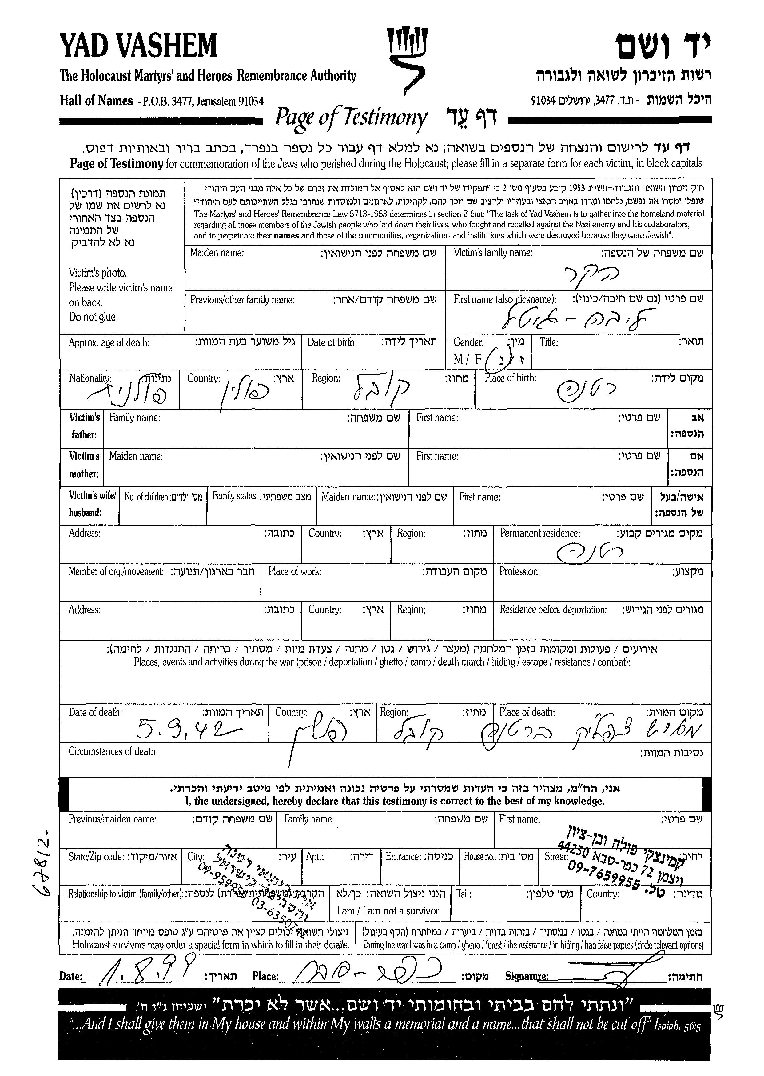 Yad Vashem - Pages of Testimony Names Memorial Collection