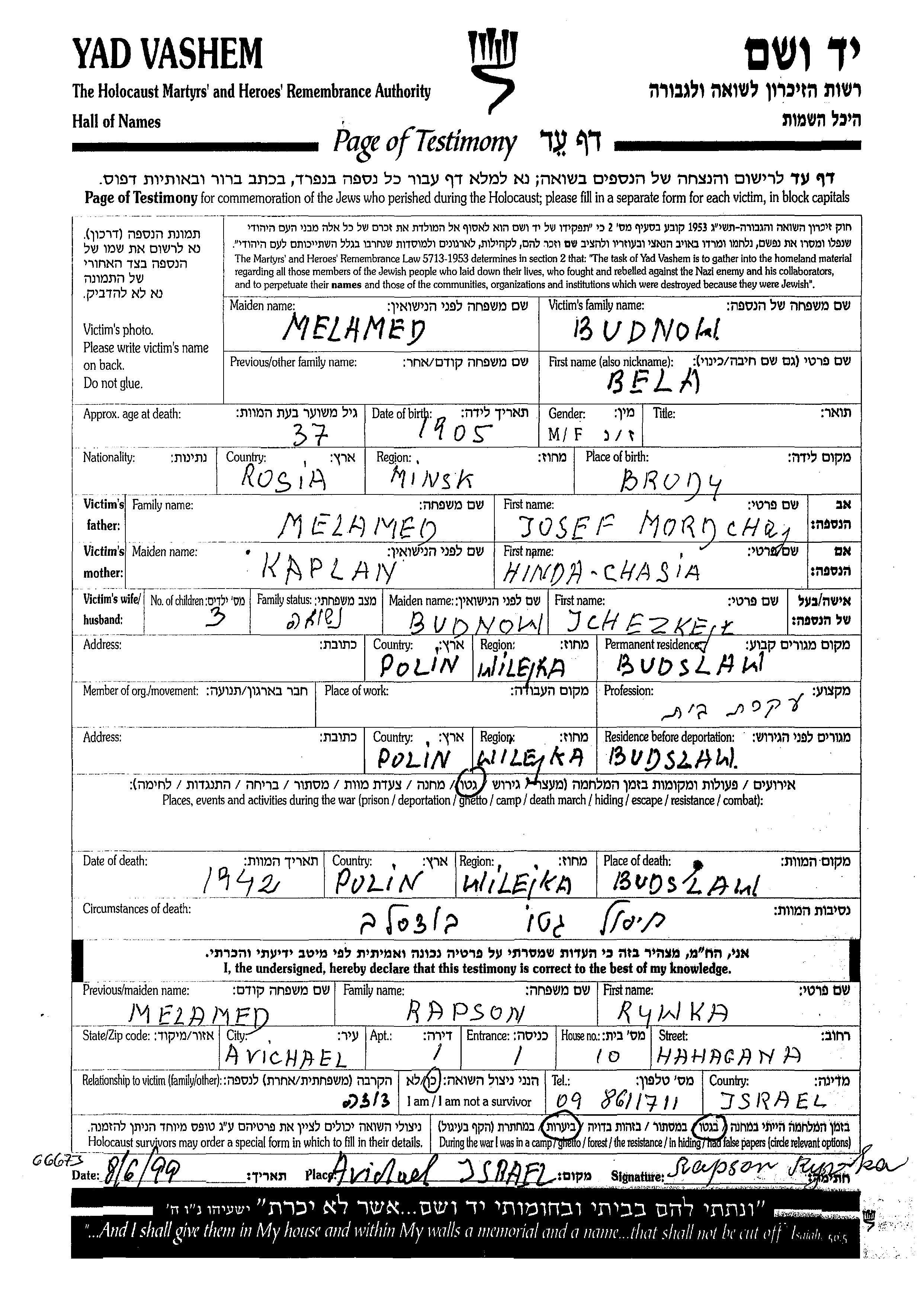 Bela Budnow nee Melamed was born in Brod, Belorussia (USSR), 1905 to Yosef Mordchaj and Hinda Chasia. She was a housewife and married to Ichezkejl. Prior to WWII she lived in Budslaw, Poland. During the war she was in Budslaw, Poland. Bela was murdered in the Shoah. Place of death: Budslaw, Poland, 1942.