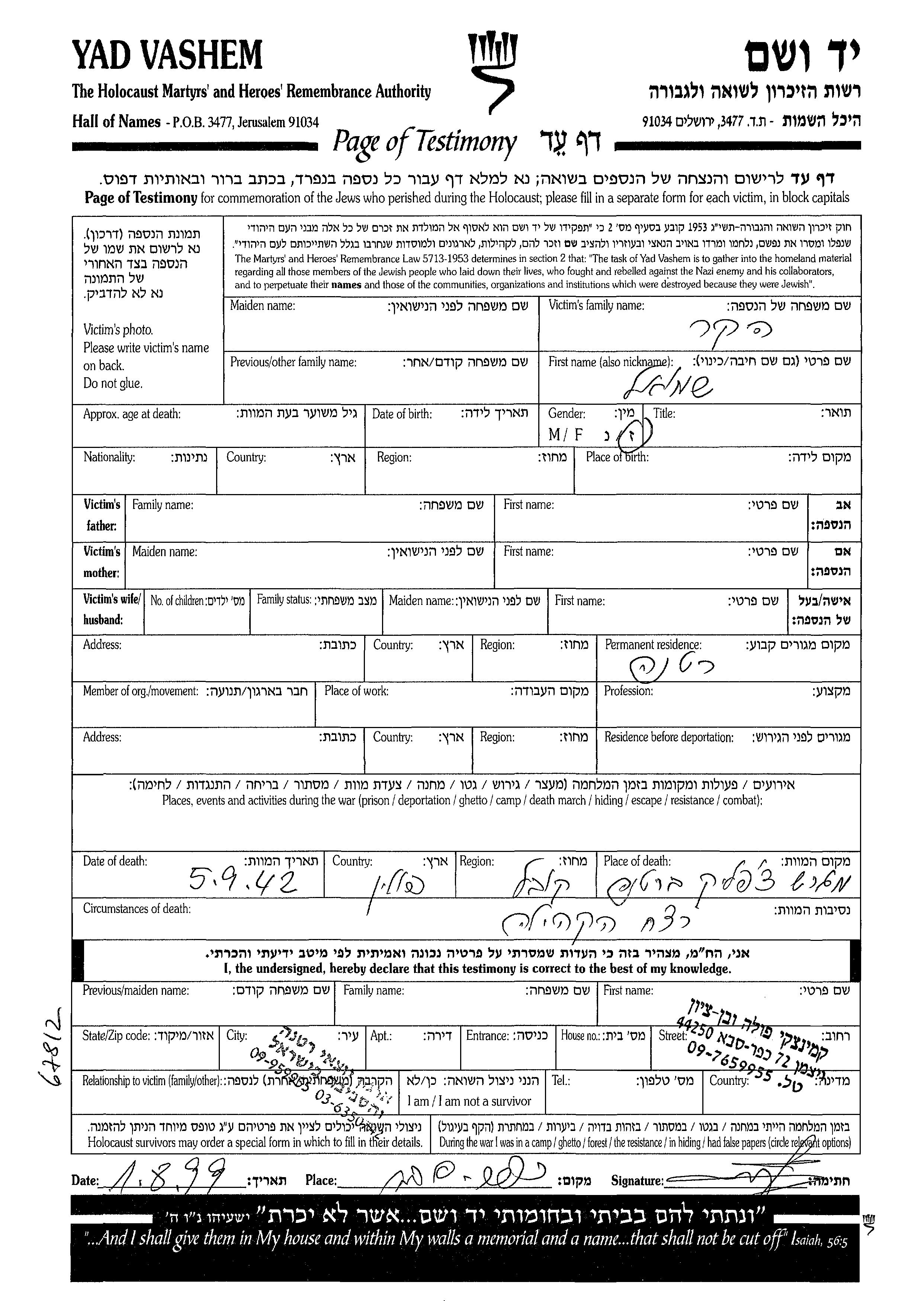 Yad Vashem - Pages of Testimony Names Memorial Collection