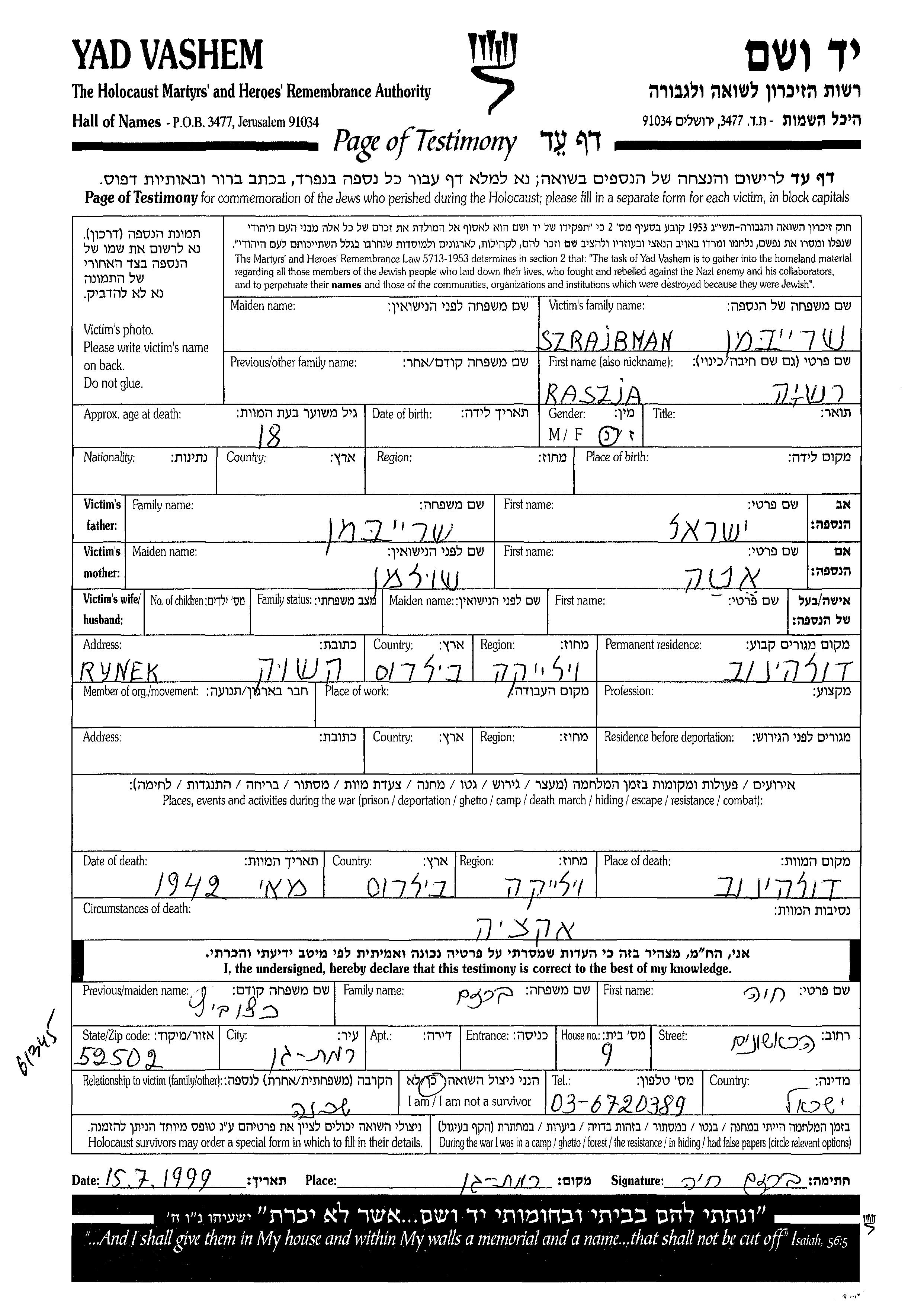 Szrajbman Raszja Dolhinow, Poland Page of Testimony