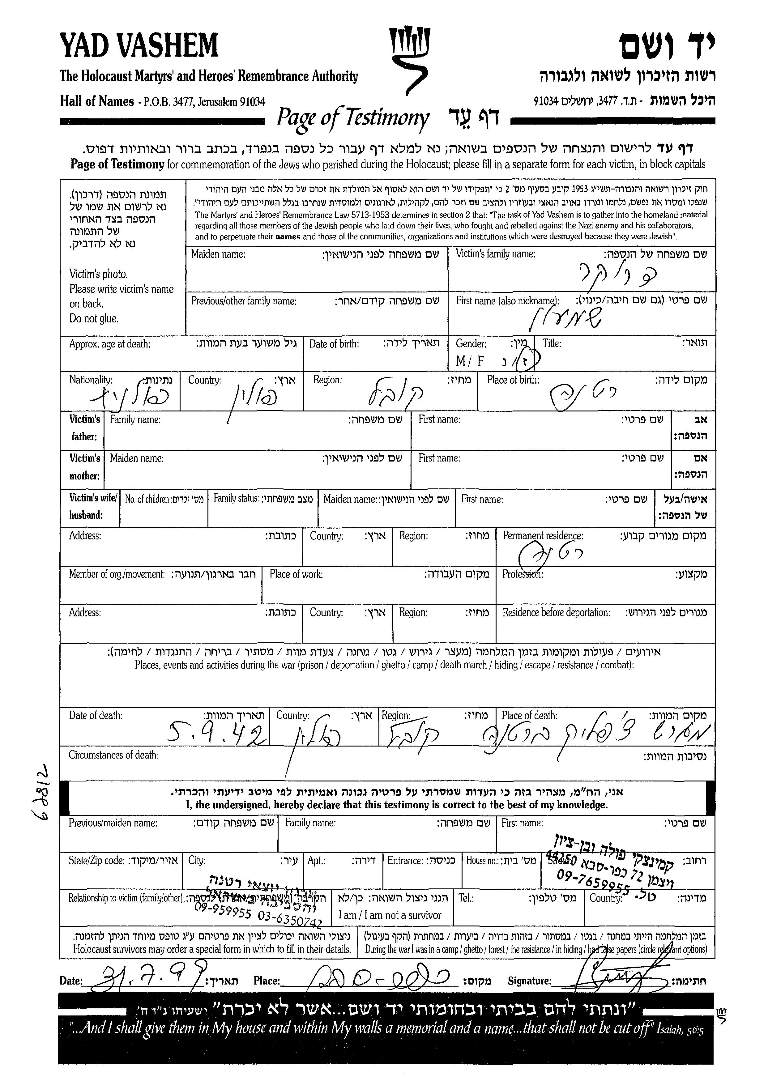 Yad Vashem - Pages of Testimony Names Memorial Collection