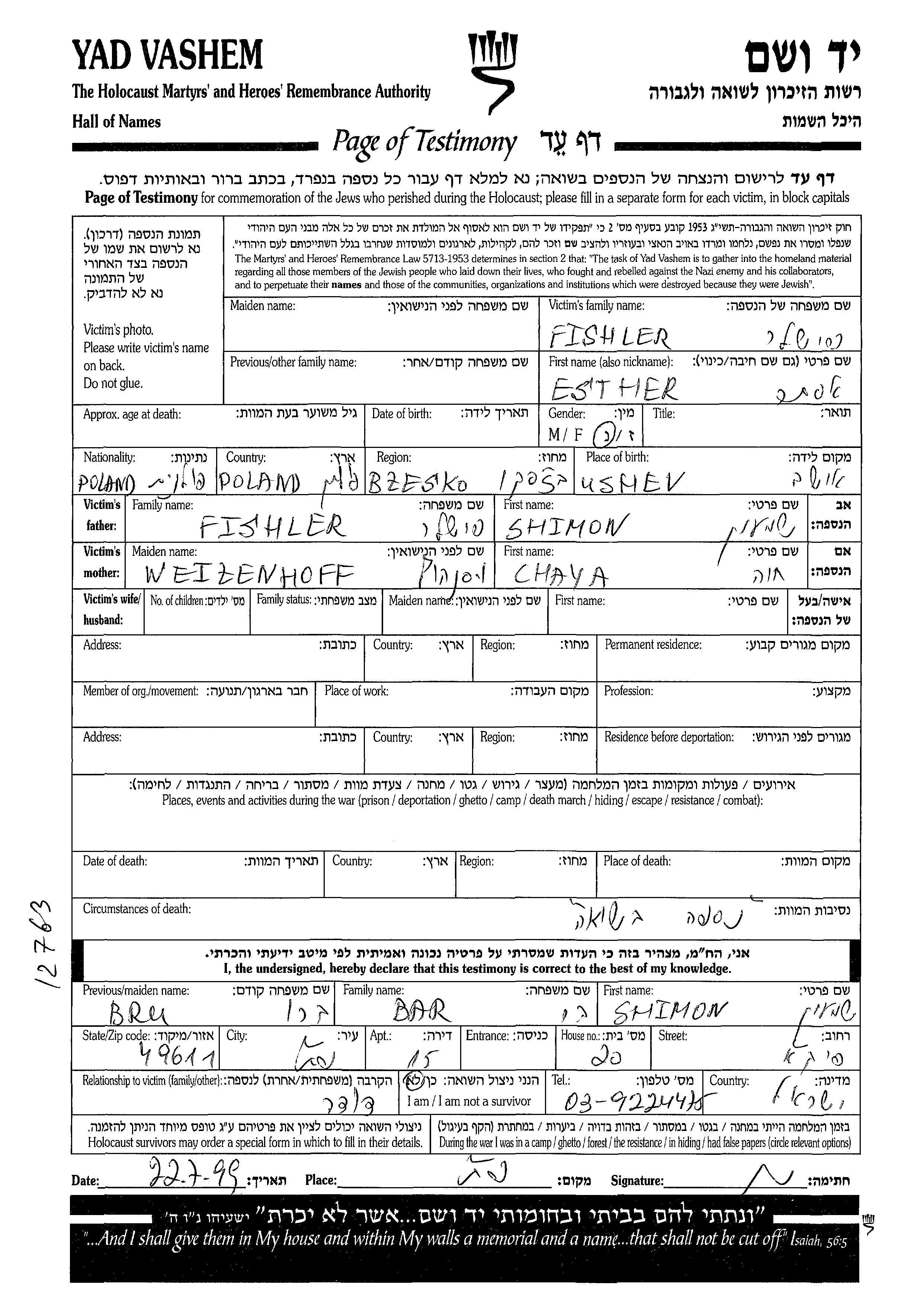Fishler Esther unstated place, Page of Testimony
