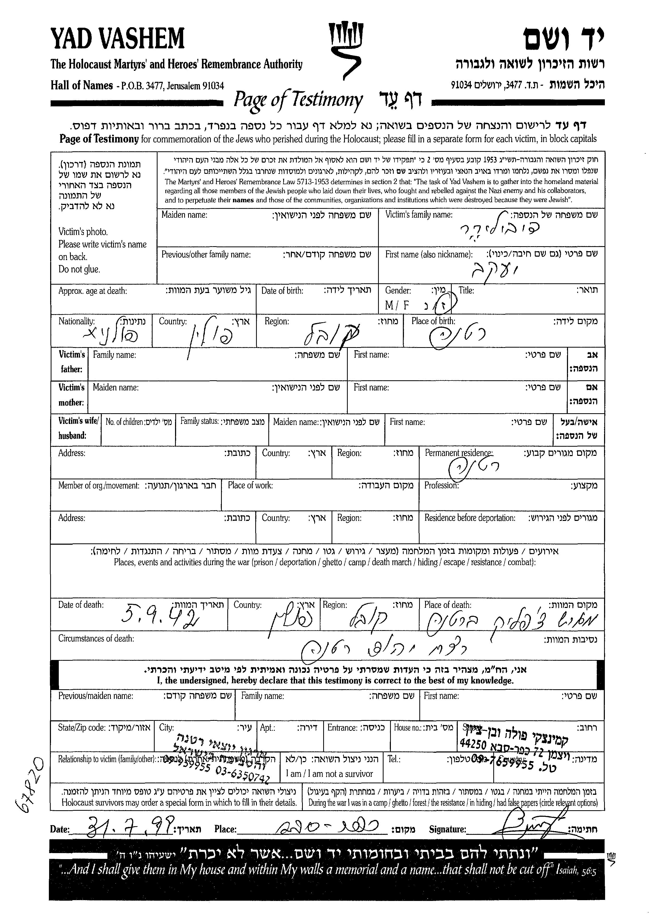 Yad Vashem - Pages of Testimony Names Memorial Collection