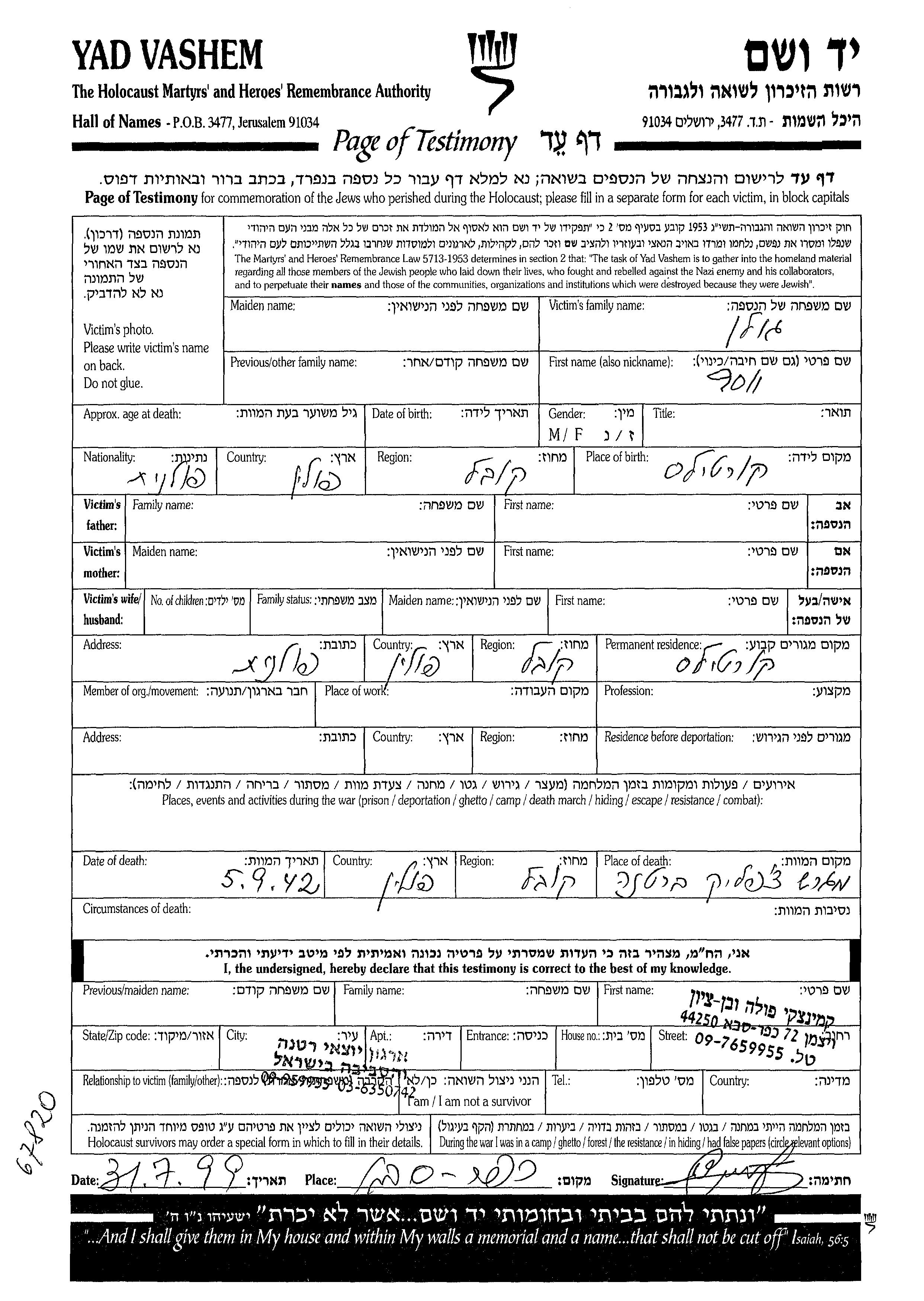 Golan Yosef Kortilas, Poland Page of Testimony