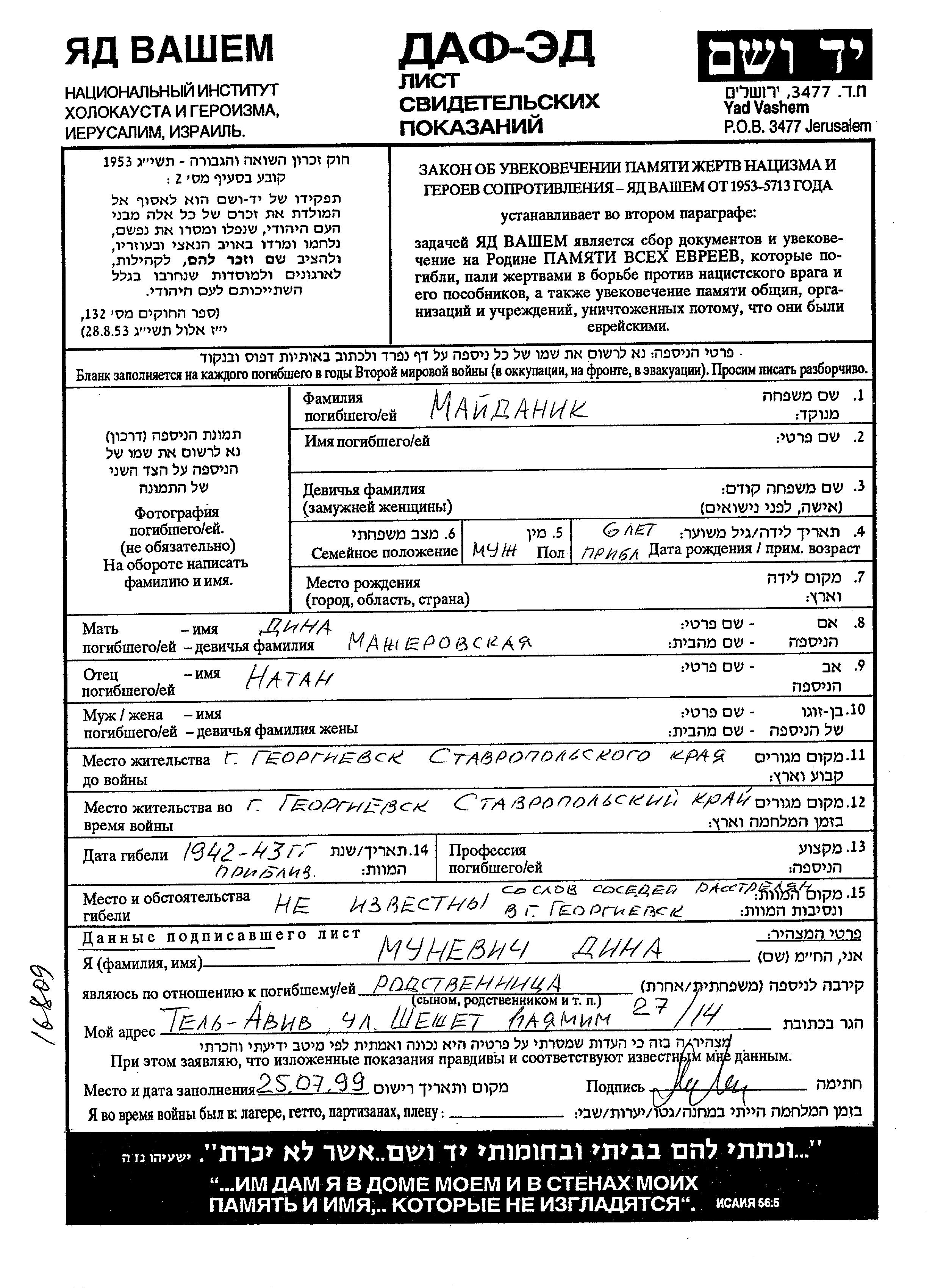 First name unknown Maidanik was born to Natan and Dina nee Mazherovskaya. Prior to WWII he lived in Georgiyevsk, Russia (USSR). During the war he was in Georgiyevsk, Russia (USSR). He was murdered in the Shoah. Place of death: Georgiyevsk, Russia (USSR), 1942.