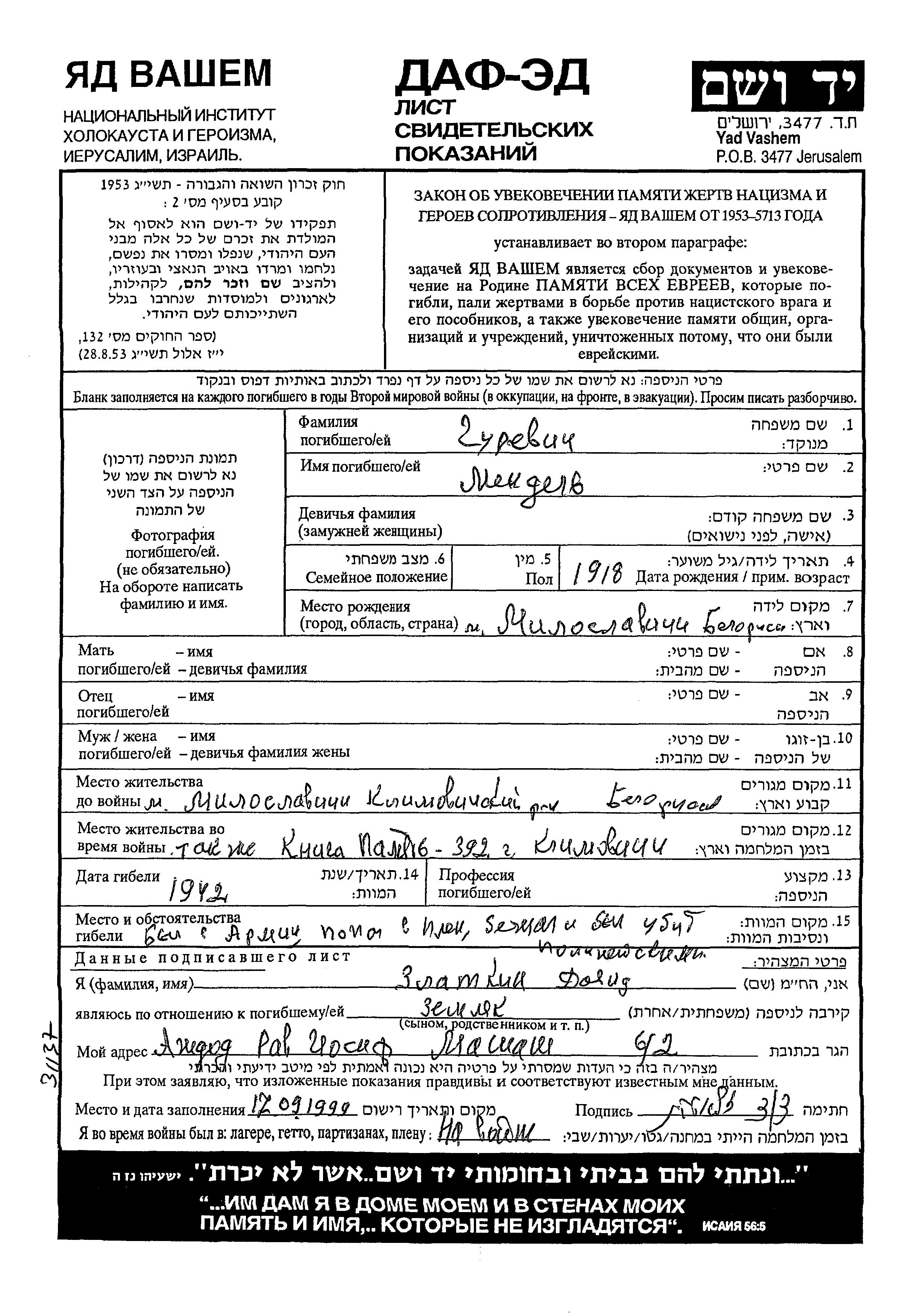 Mendel Gurevich was born in Miloslavichi, Belorussia (USSR), 1918. Prior to WWII he lived in Miloslavichi, Belorussia (USSR). During the war he was in the Soviet armed forces. Mendel was killed in military service in WWII. Place of death: the Soviet armed forces, 1942.