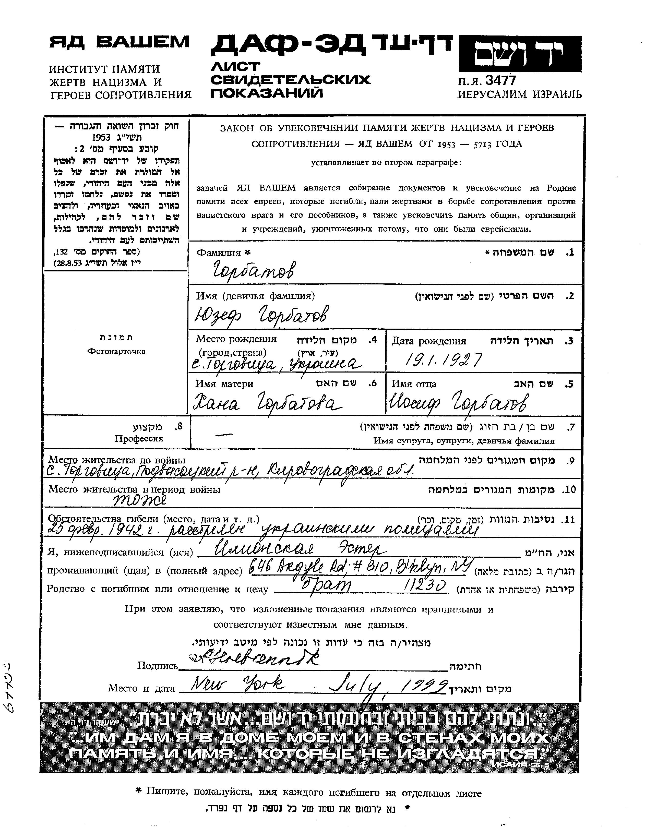 Yuzef Gorbatov was born in Torgovitsa, Ukraine (USSR), 1927 to Iosif and Khana. Prior to WWII he lived in Torgovitsa, Ukraine (USSR). During the war he was in Torgovitsa, Ukraine (USSR). Yuzef was murdered in the Shoah. Place of death: unknown, 1942.