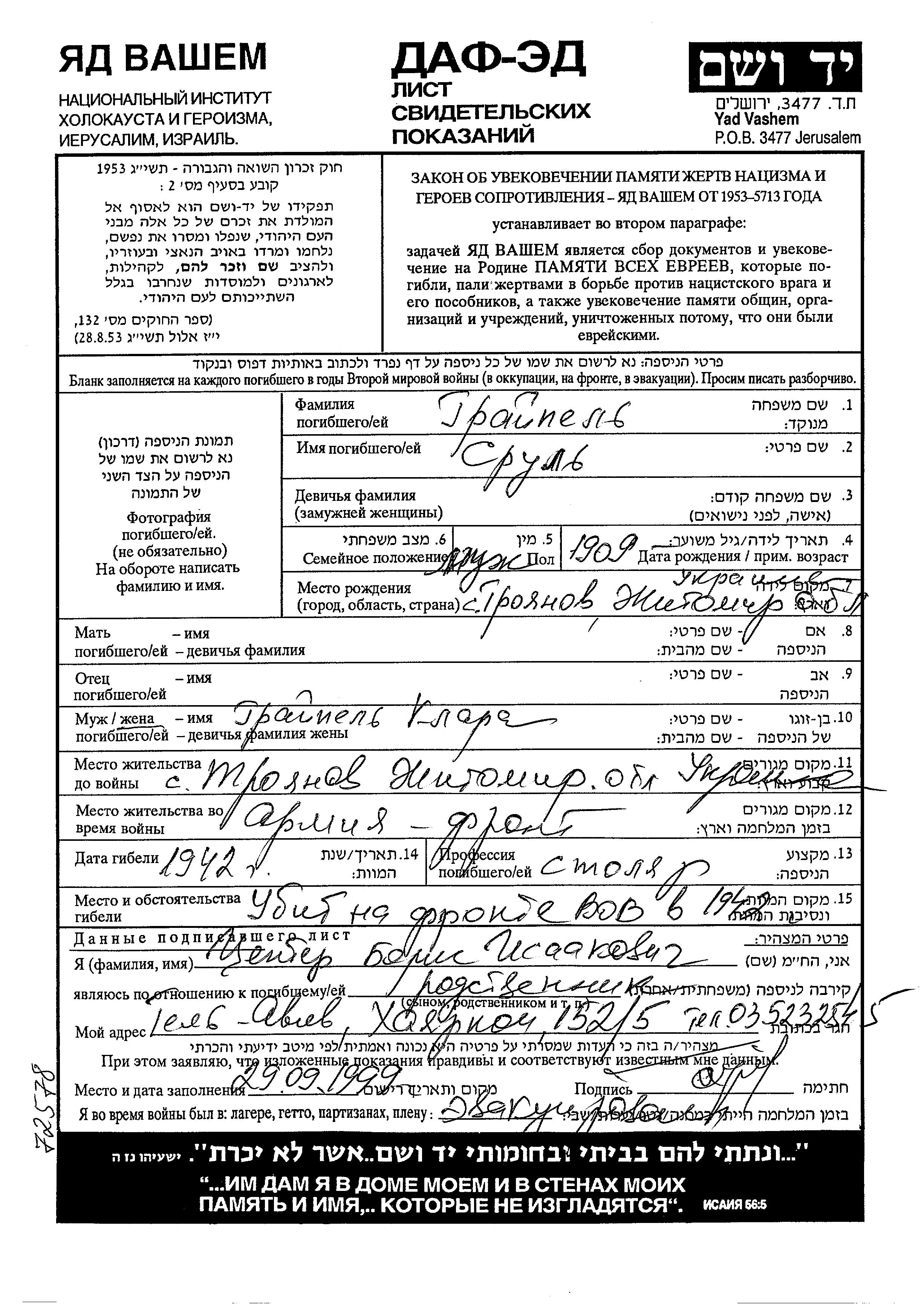 Srul Graipel was born in Troyanov, Ukraine (USSR), 1909. He was a cabinet maker. Prior to WWII he lived in Troyanov, Ukraine (USSR). During the war he was in Troyanov, Ukraine (USSR). Srul was killed in military service in WWII. Place of death: the Soviet armed forces, 1942.