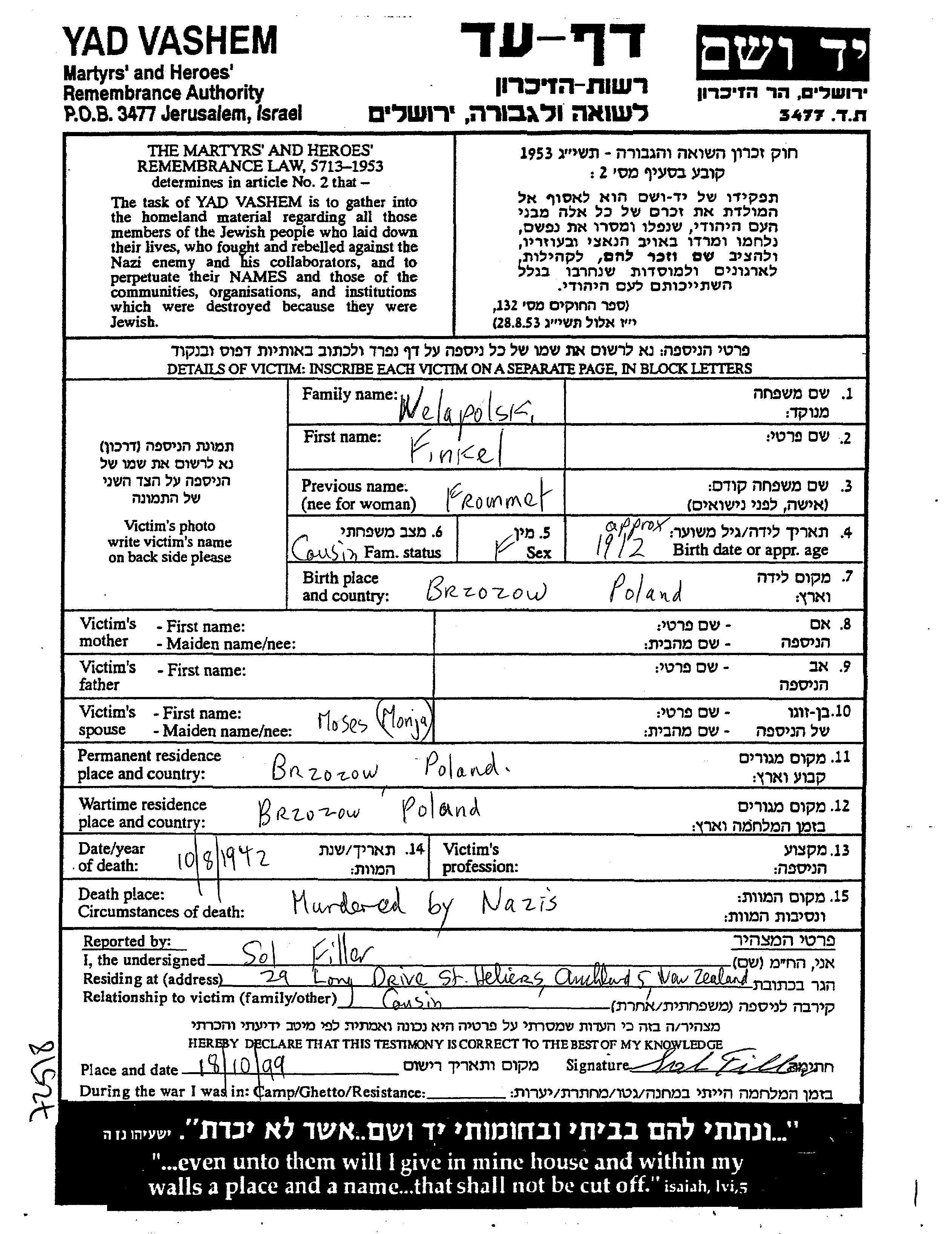 Frommet Welapolski nee Finkel was born in Brzozow, Poland, 1912. She was married to Moses Monja. Prior to WWII she lived in Brzozow, Poland. During the war she was in Brzozow, Poland. Frommet was murdered in the Shoah. Place of death: Brzozow, Poland, 1942.