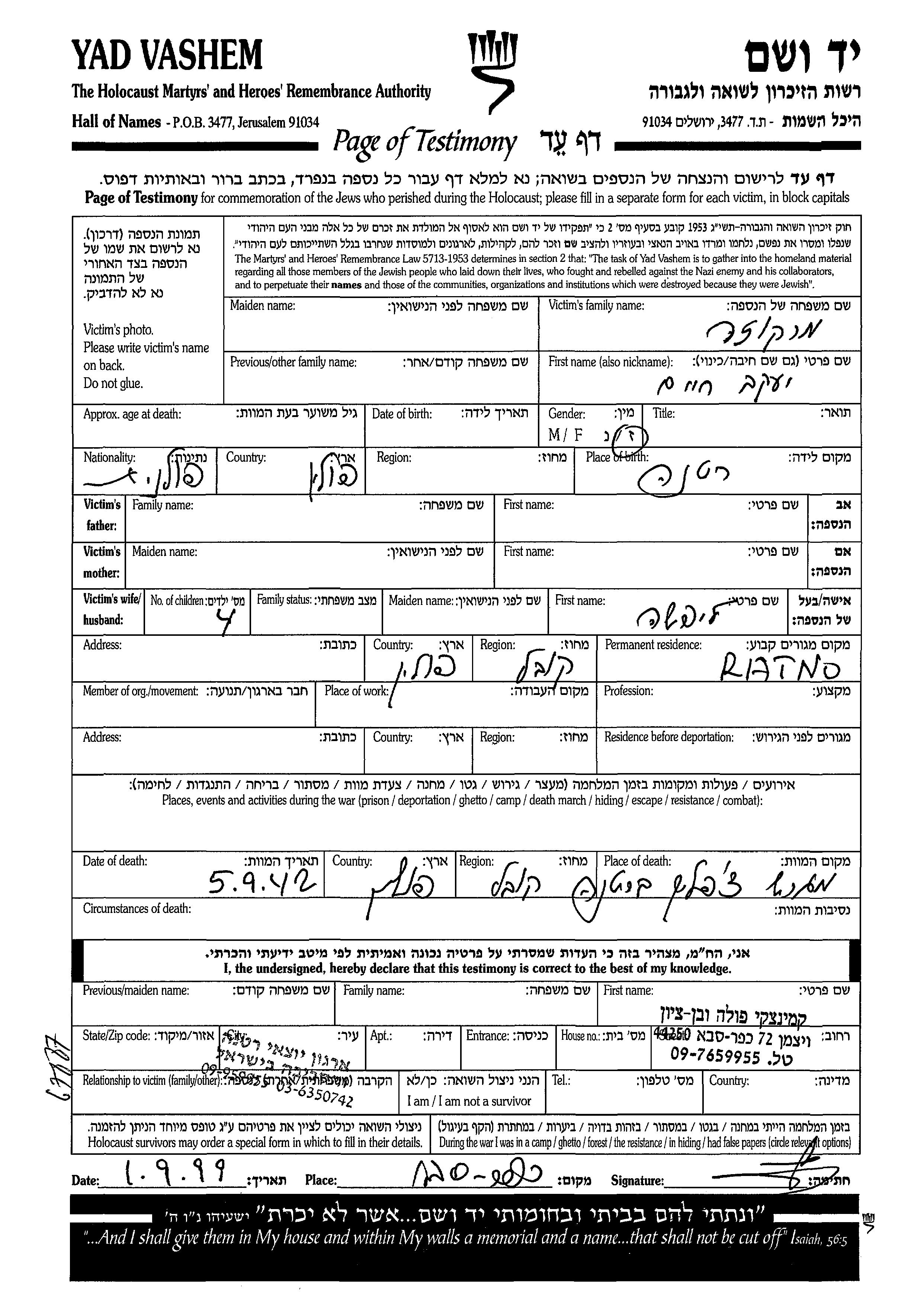 Yad Vashem - Pages of Testimony Names Memorial Collection