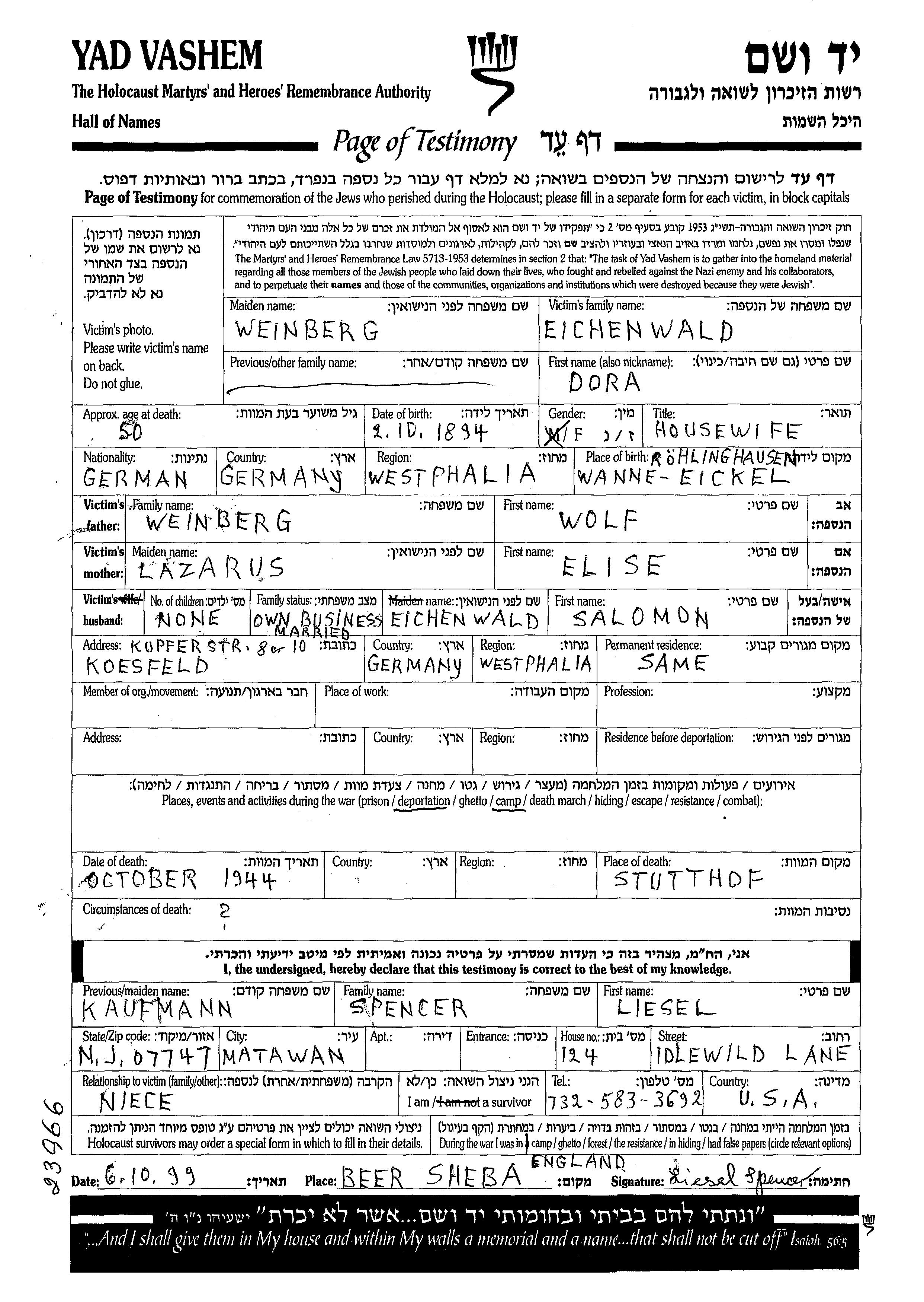 Eichenwald Dora 1894 Wanne Eickel, Germany Page of Testimony