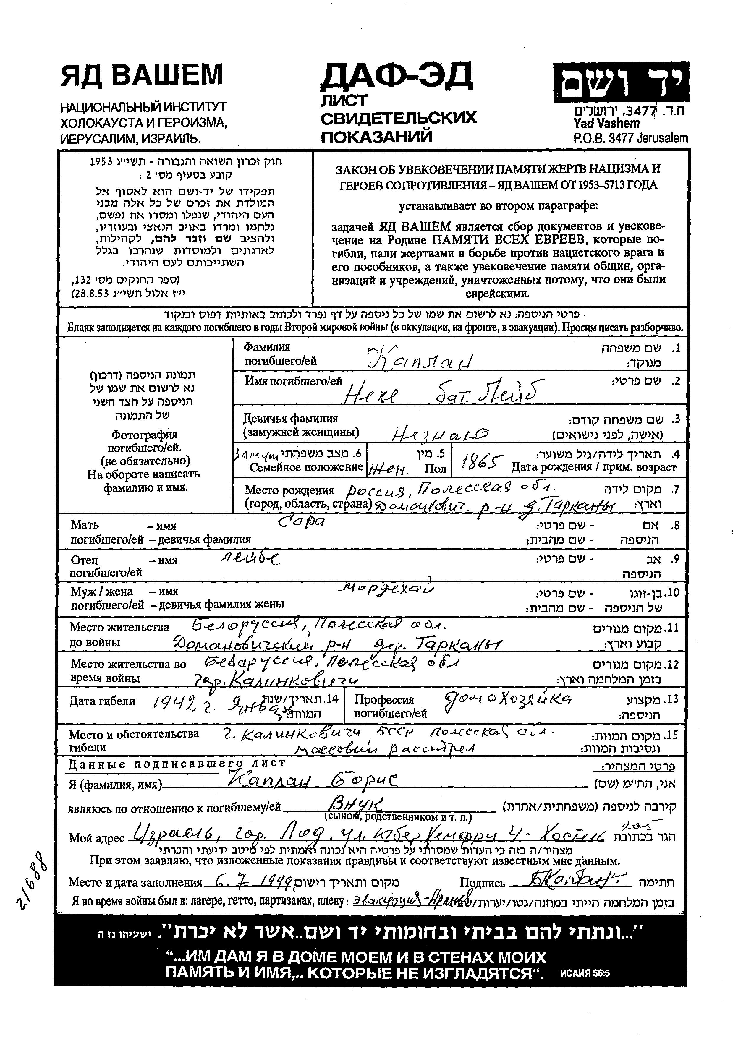 Kaplan Nekhe 1865 Tarkany, Page of Testimony