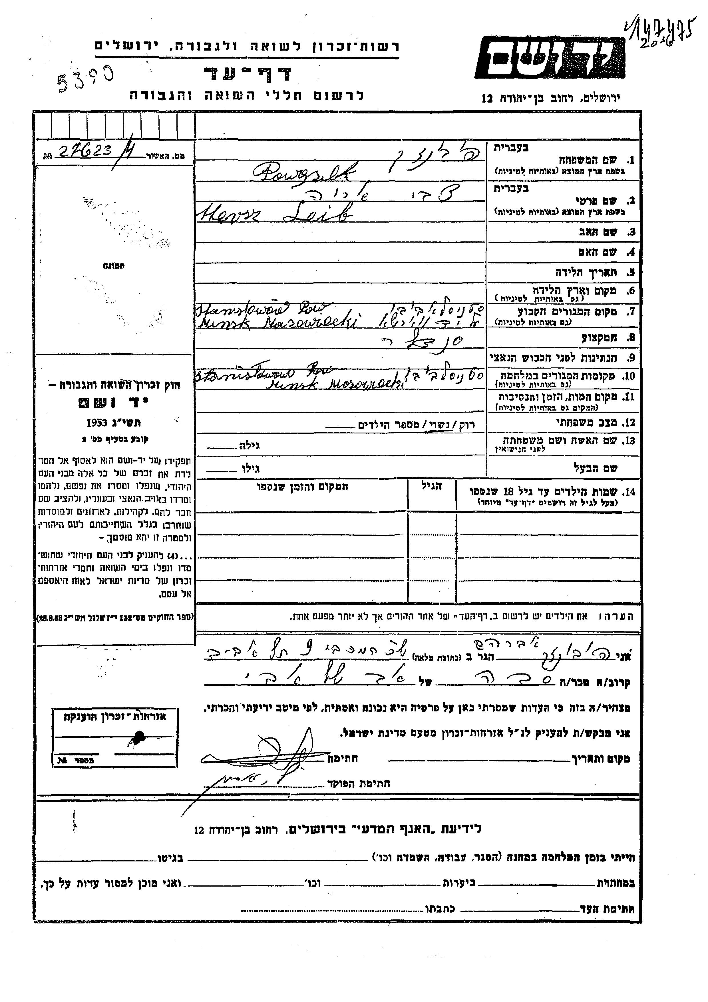 Powonzek Hersz Leib Tzvi Arie Stanislawow, Poland Page of Testimony