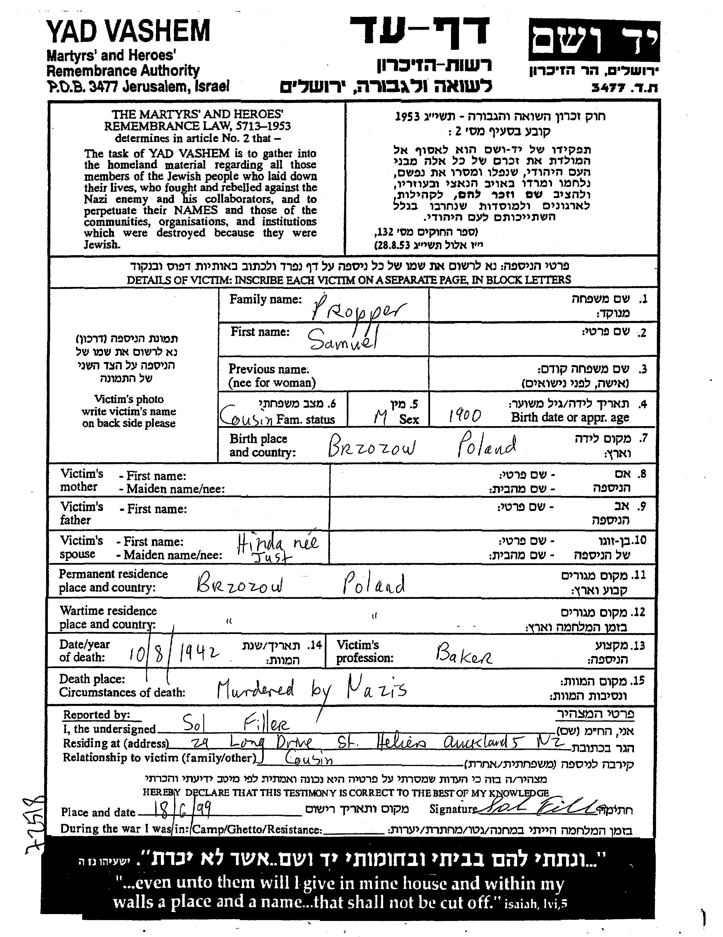 Samuel Propper was born in Brzozov, Poland, 1900. He was a baker and married to Hinda nee Just. Prior to WWII he lived in Brzozov, Poland. During the war he was in Brzozov, Poland. Samuel was murdered in the Shoah. Place of death: unknown, 1942.