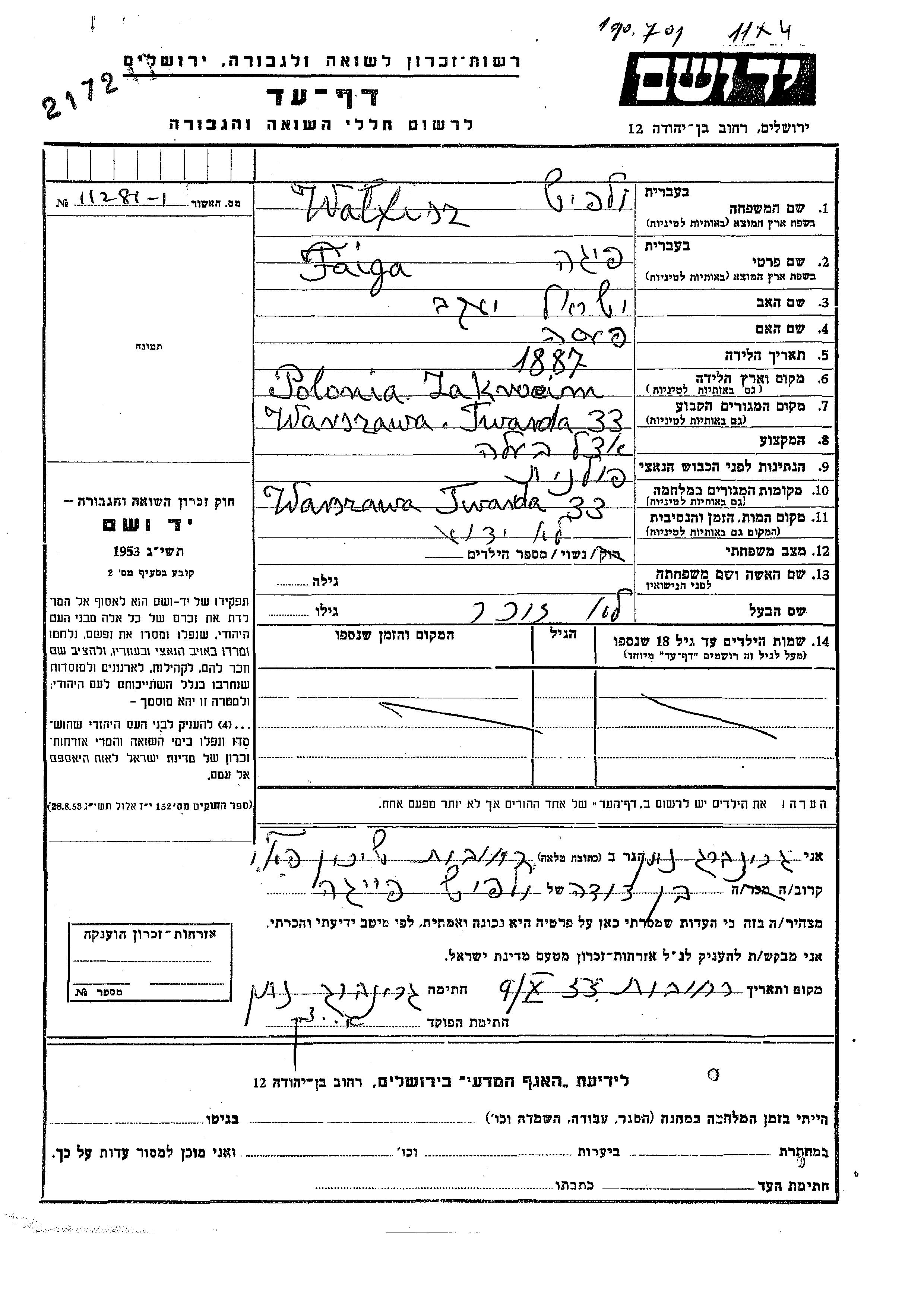 Faiga Walfisz was born in Zakrochim, Poland, 1887 to Yisrael Yaakov and Pesa. She was married. Prior to WWII she lived in Warszawa, Poland. During the war she was in Varsha, Poland. Faiga was murdered in the Shoah.