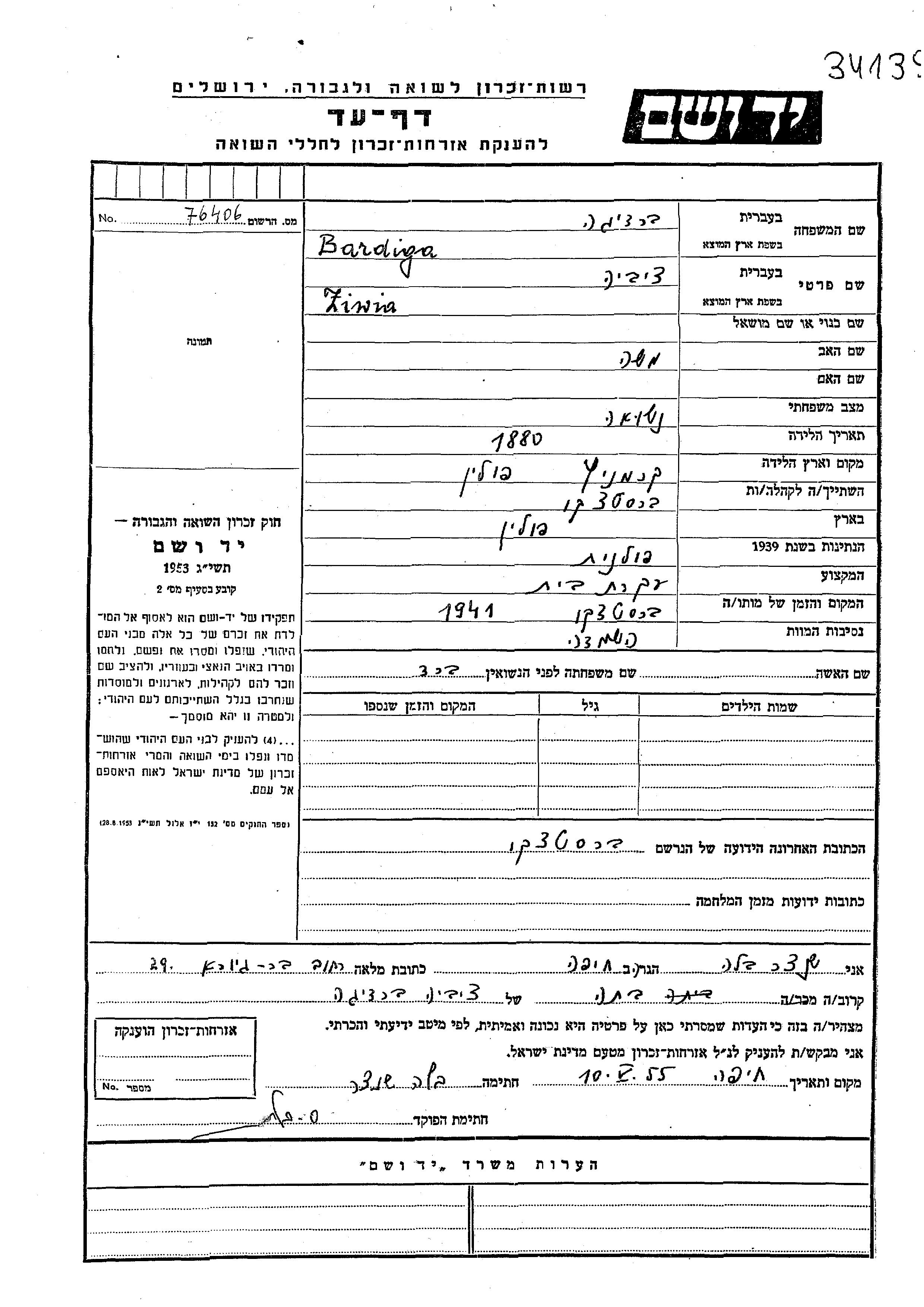 Bardiga Ziwia 1880 Beresteczko, Poland Page of Testimony