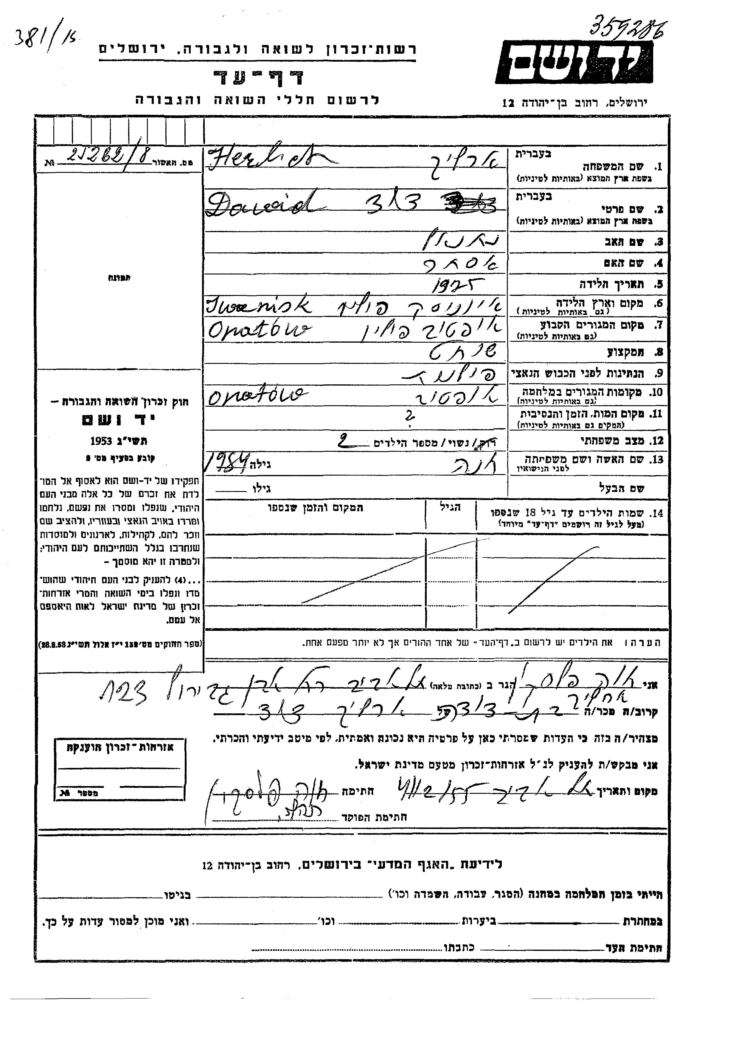 David Herlich Ehrlich was born in Iwaniska, Poland, 1925 to Natanel and Ester. He was a ritual slaughterer and married to Khana. Prior to WWII he lived in Opatow, Poland. During the war he was in Opatow, Poland. David was murdered in the Shoah.
