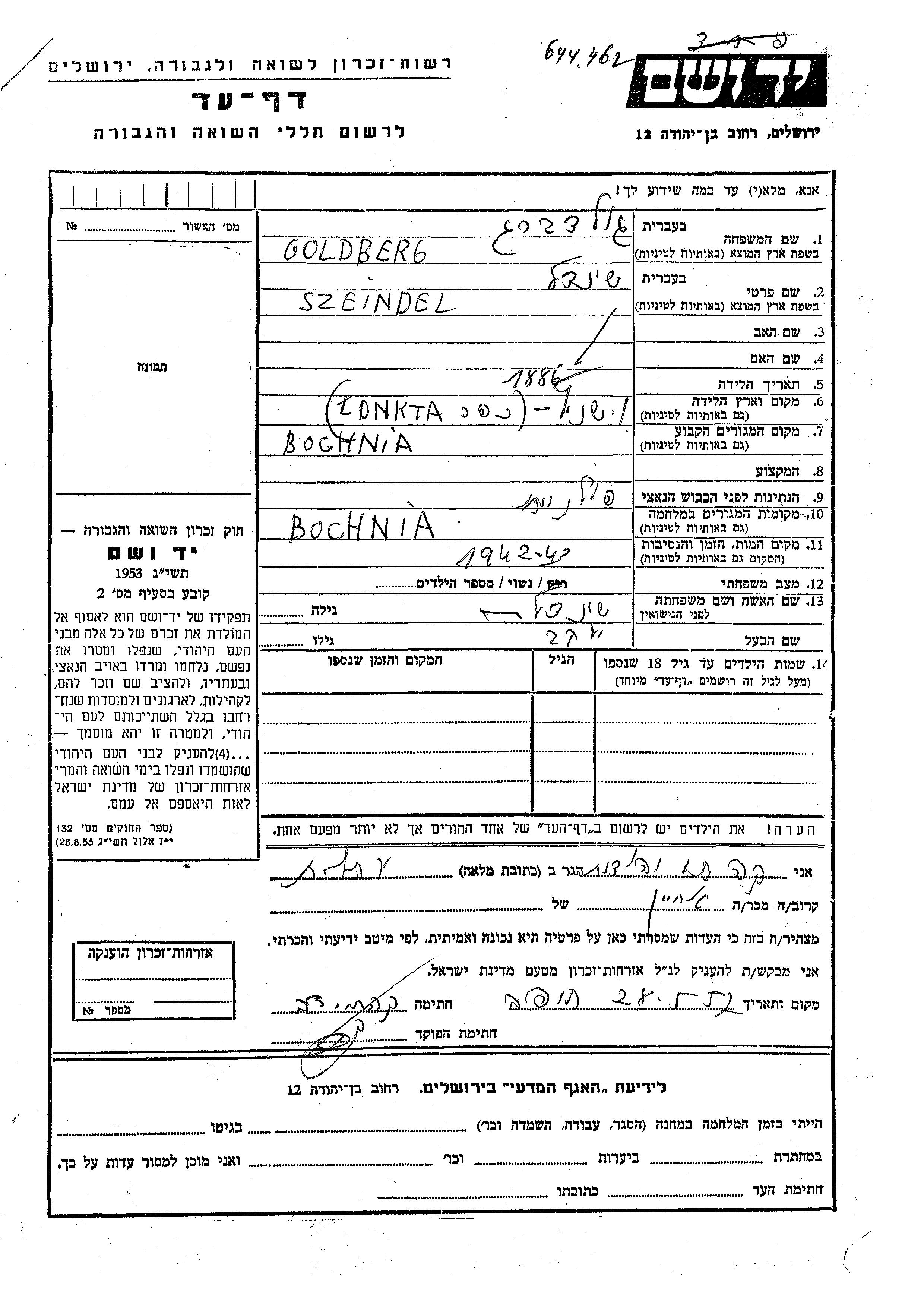 Szeindel Goldberg was born in Lakta, Poland, 1886. She was married to Yaakov. Prior to WWII she lived in Bochnia, Poland. During the war she was in Bochnia, Poland. Szeindel was murdered in the Shoah. Place of death: unknown, 1942.