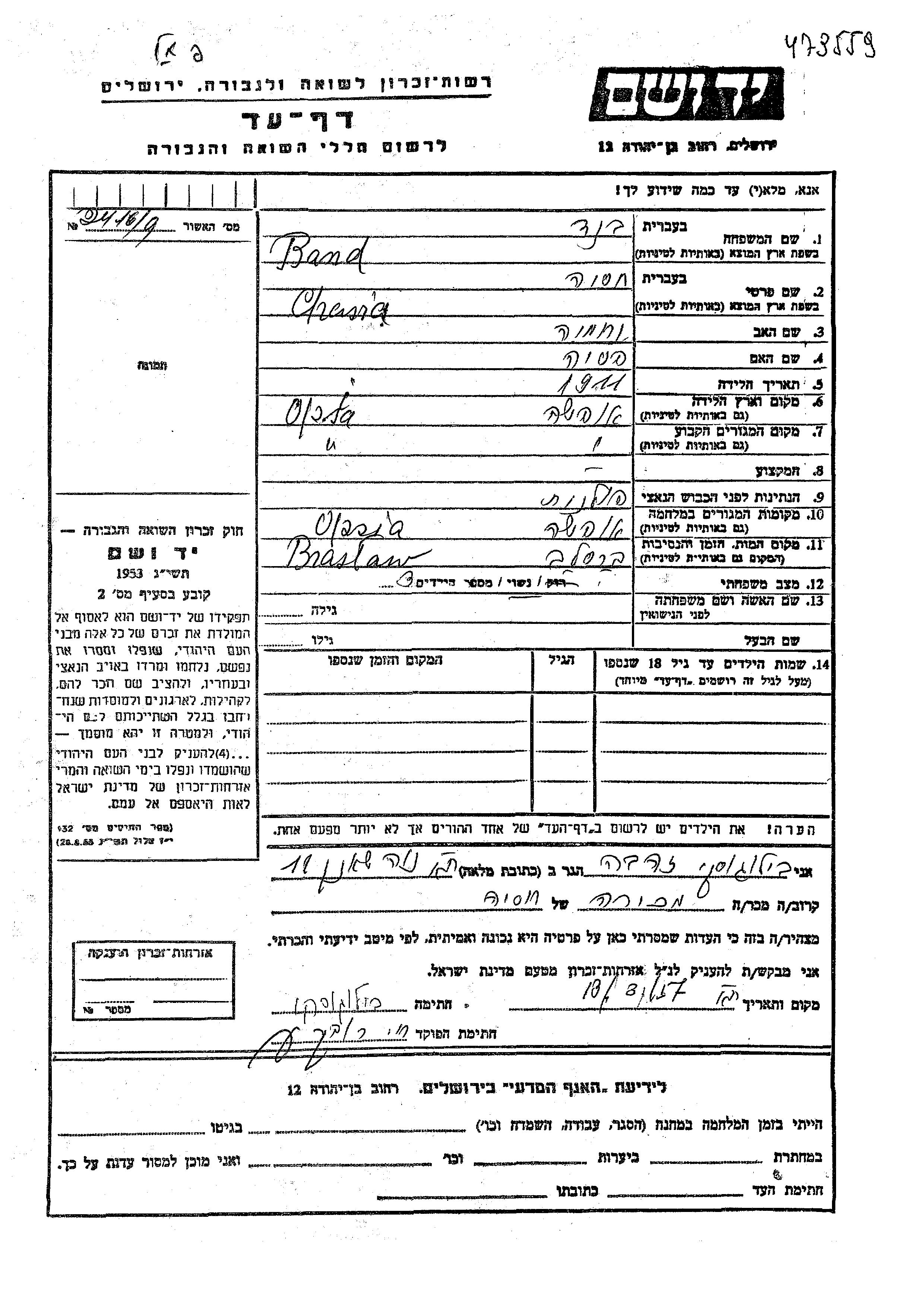 Chasia Band was born in Opsa, Poland, 1911 to Nekhemia and Pesia. She was married. Prior to WWII she lived in Opsa, Poland. During the war she was in Opsa, Poland. Chasia was murdered in the Shoah. Place of death: Braslaw, Poland.