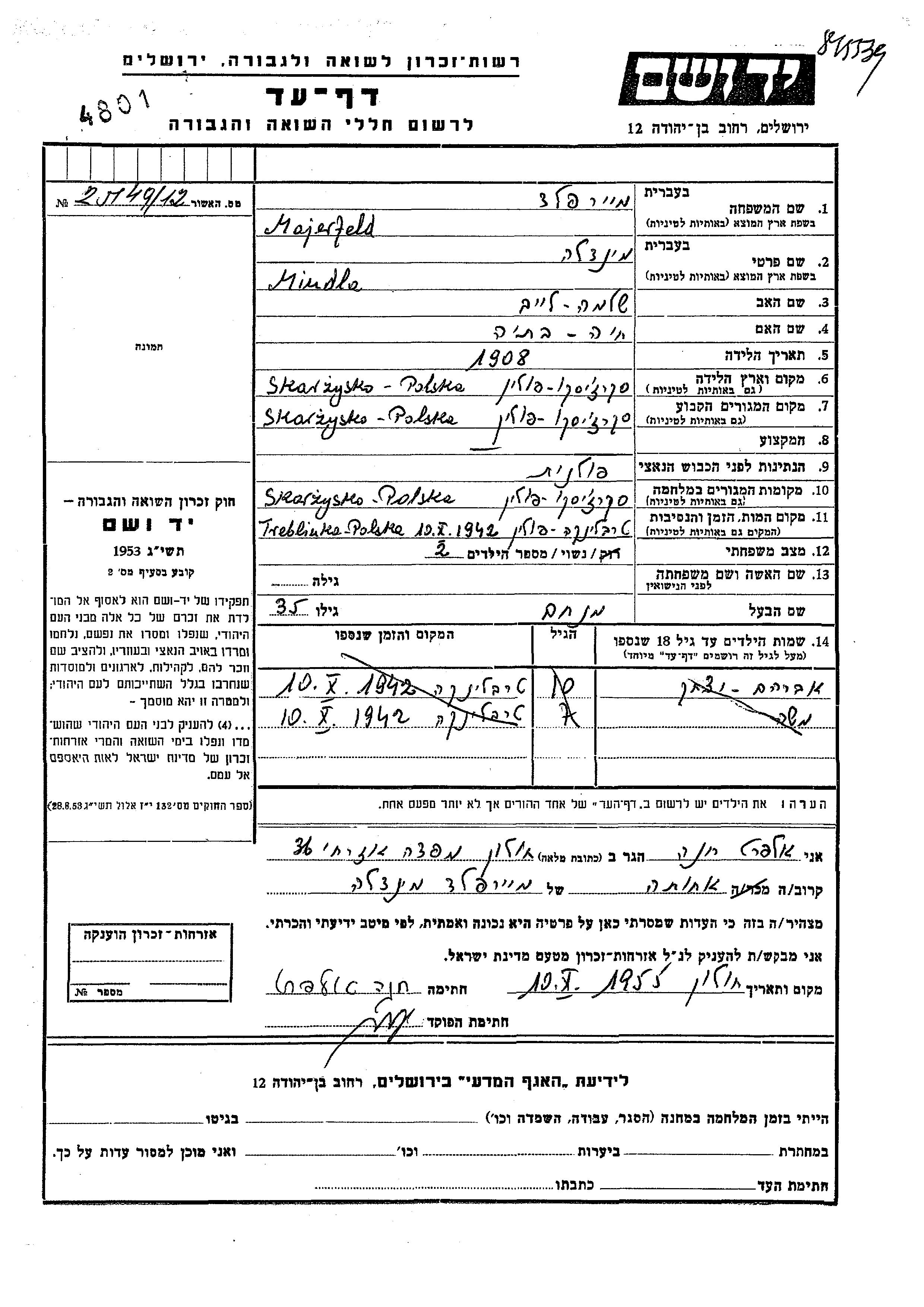 Majerfeld Mindla 1908 Skarzysko Kamienna, Poland Page of Testimony