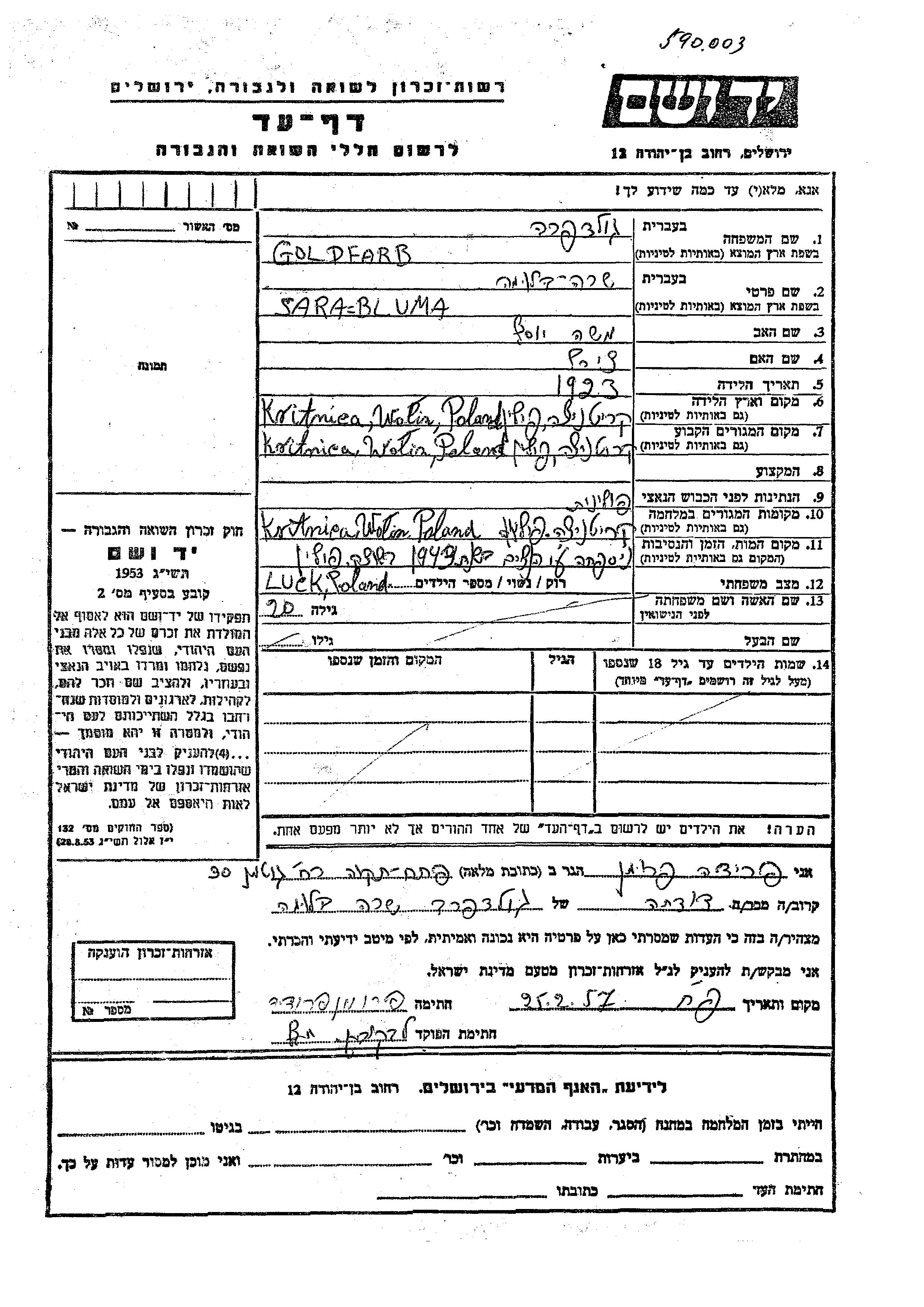 Sara Bluma Goldfarb was born in Kritnica, Poland, 1923 to Moshe Yosef and Tzirel. She was single. Prior to WWII she lived in Kritnica, Poland. During the war she was in Kritnica, Poland. Sara Bluma was murdered in the Shoah. Place of death: Luck, Poland, 1943.