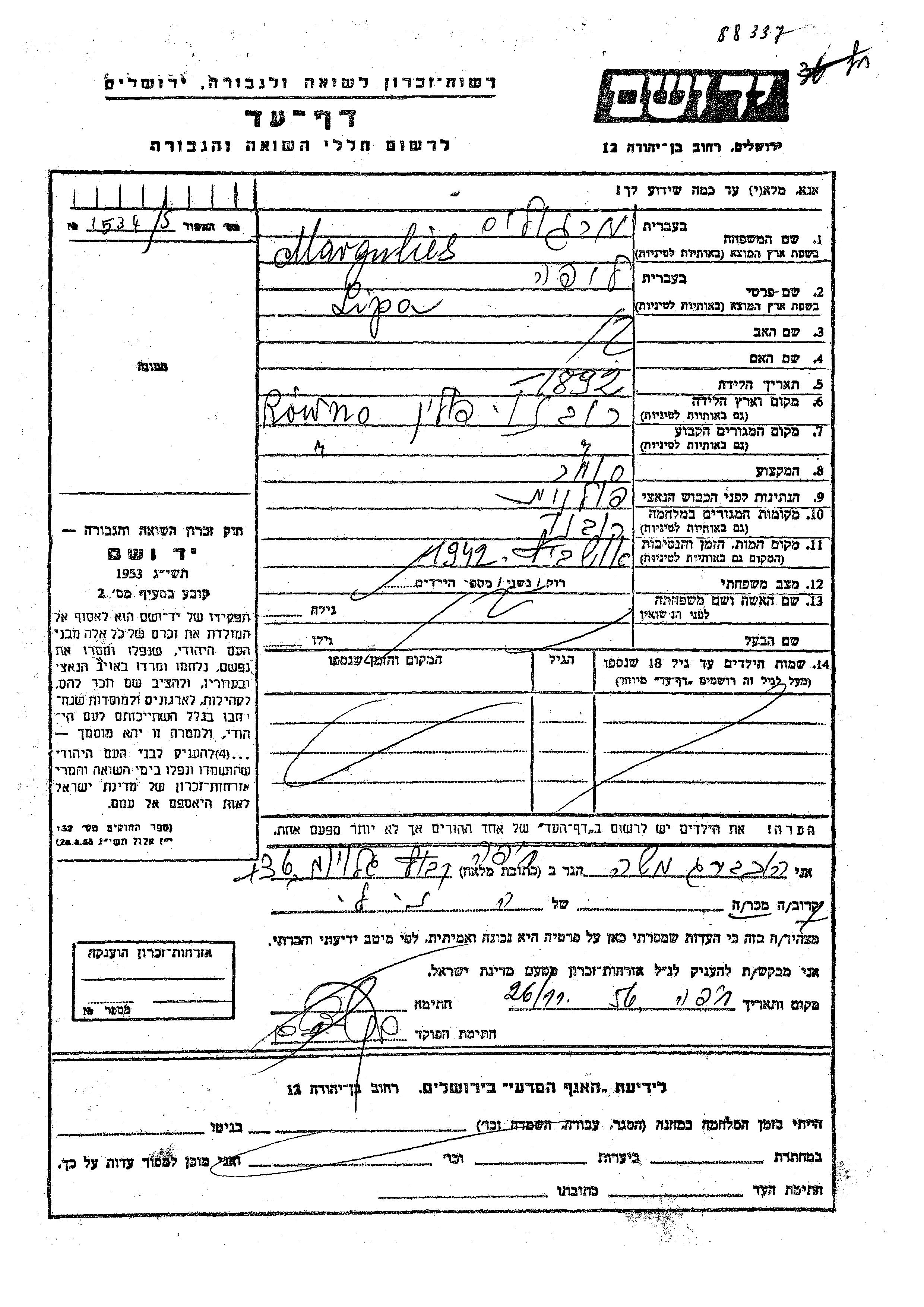 Margulies Lipa 1892 Rowno, Poland Page of Testimony