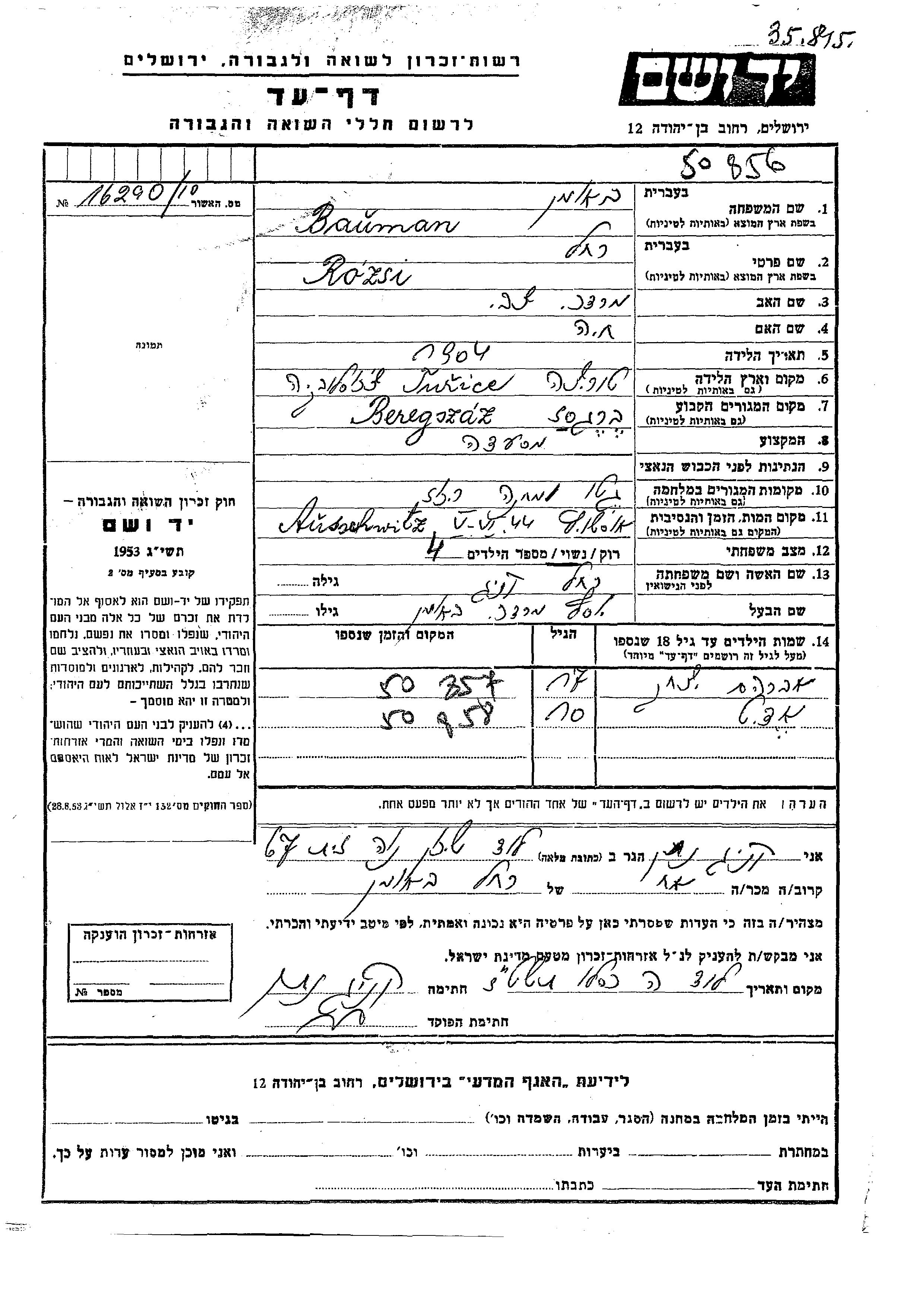 Bauman Rozsi Rakhel 1904 Beregsas, Czechoslovakia Page of Testimony