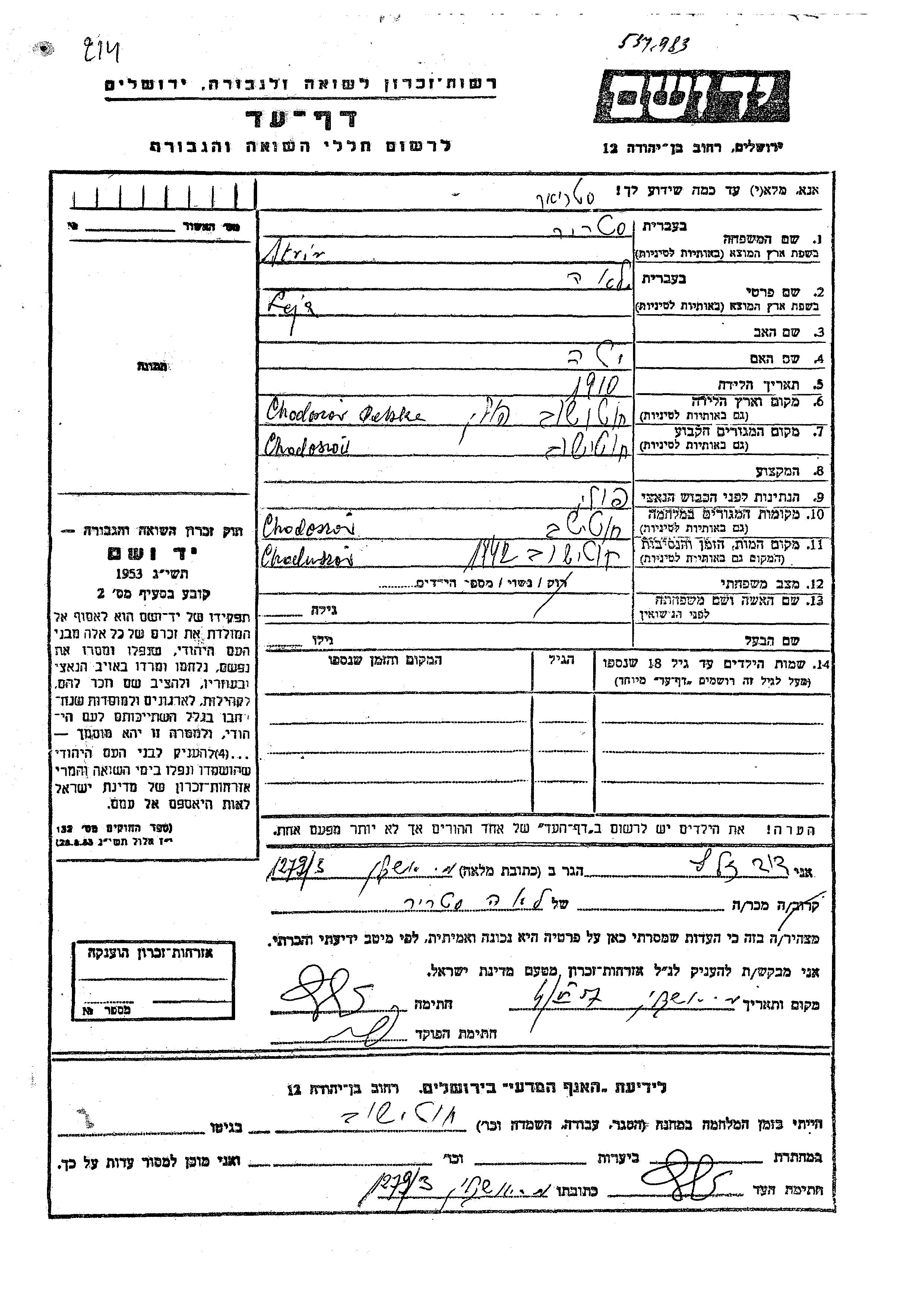 Leja Strir was born in Chocieszów, Poland, 1910 to Yeta. She was married. Prior to WWII she lived in Chocieszów, Poland. During the war she was in Chocieszów, Poland. Leja was murdered in the Shoah. Place of death: Chocieszów, Poland, 1942.