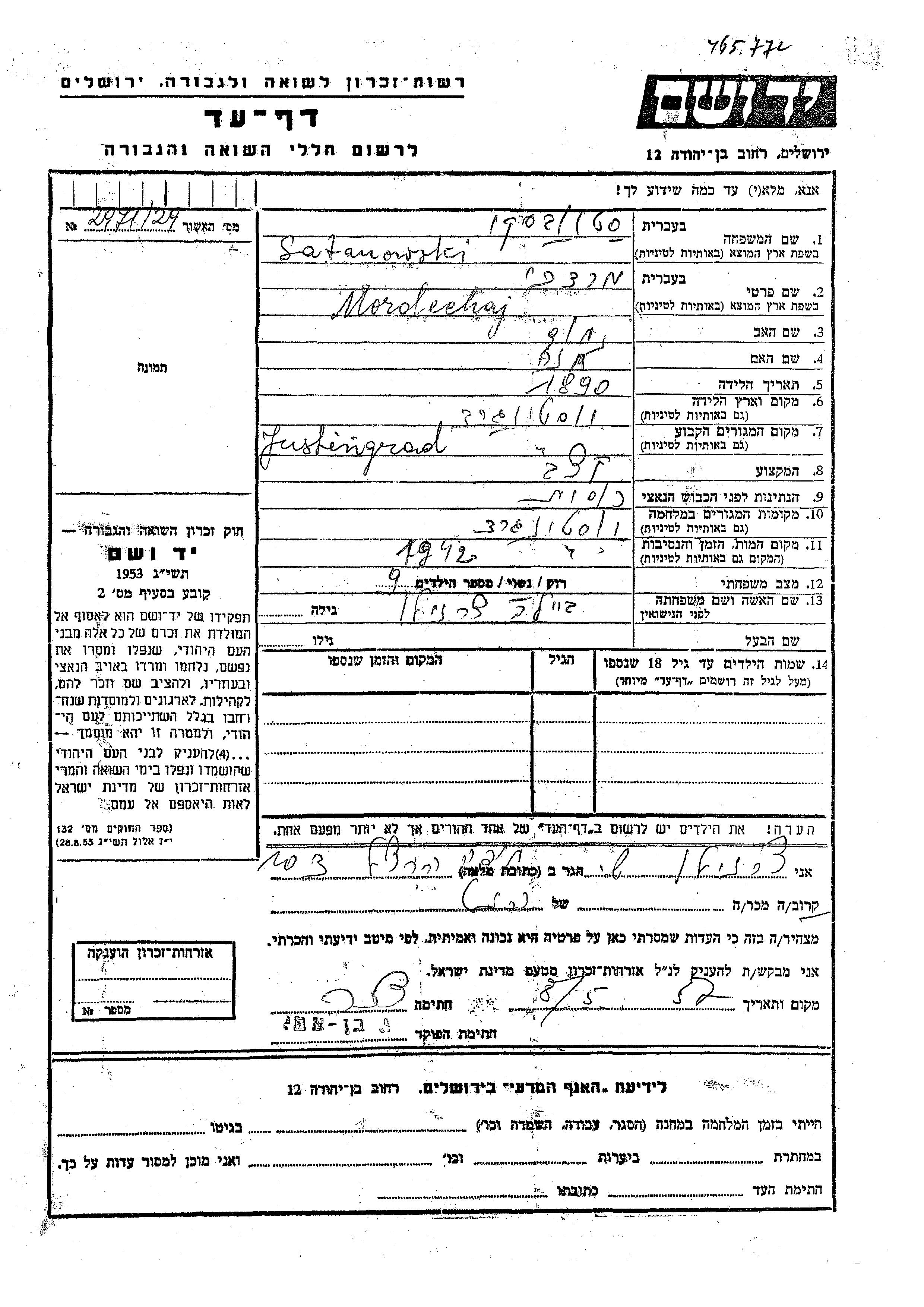 Mordechaj Satanowski was born in Yustingrad, Ukraine (USSR), 1890 to Nakhum and Khana. He was a butcher and married to Beila nee Chernilo. Prior to WWII he lived in Yustingrad, Ukraine (USSR). During the war he was in Yustingrad, Ukraine (USSR). Mordechaj was murdered in the Shoah. Place of death: Yustingrad, Ukraine (USSR), 1942.