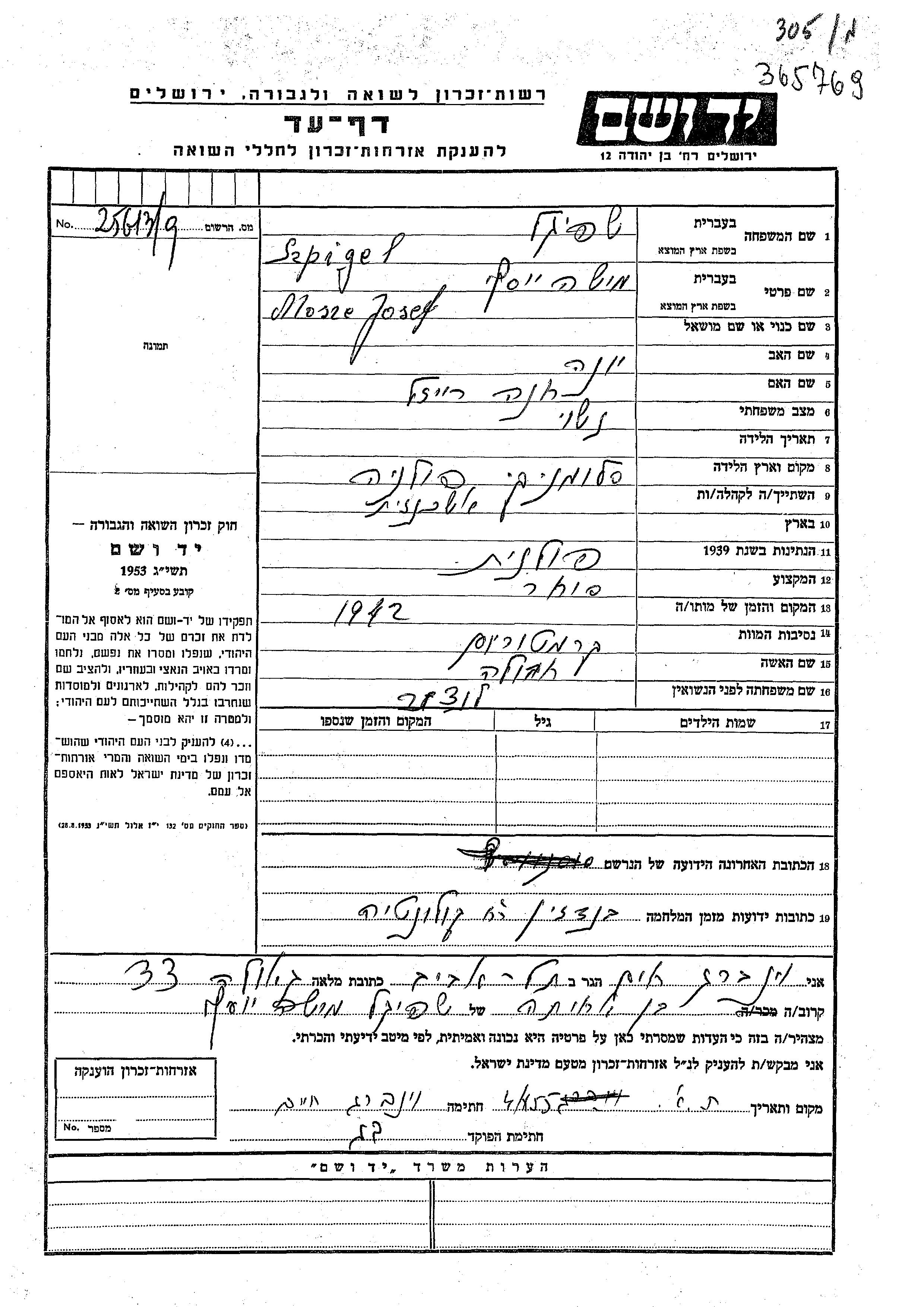 Szpigel Mosze Josef Misha unstated place, Page of Testimony