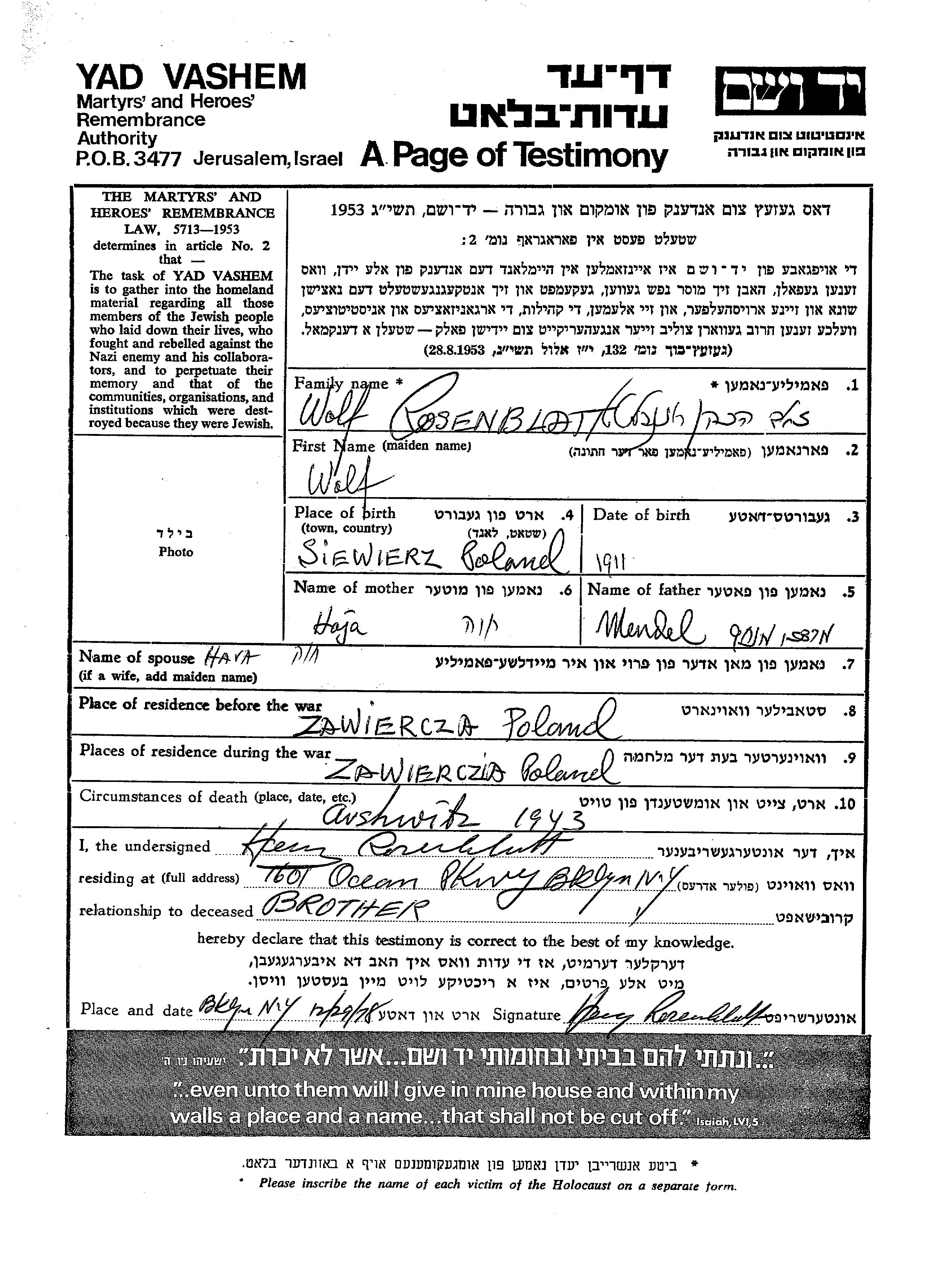 Wolf Zeev Rosenblatt Hacohen was born in Siewierz, Poland, 1911 to Mendel Mordekhai Menakhem and Haja. He was married to Hava. Prior to WWII he lived in Siewierz, Poland. During the war he was in Siewierz, Poland. Wolf Zeev was murdered in the Shoah. Place of death: Auschwitz, Poland, 1943.