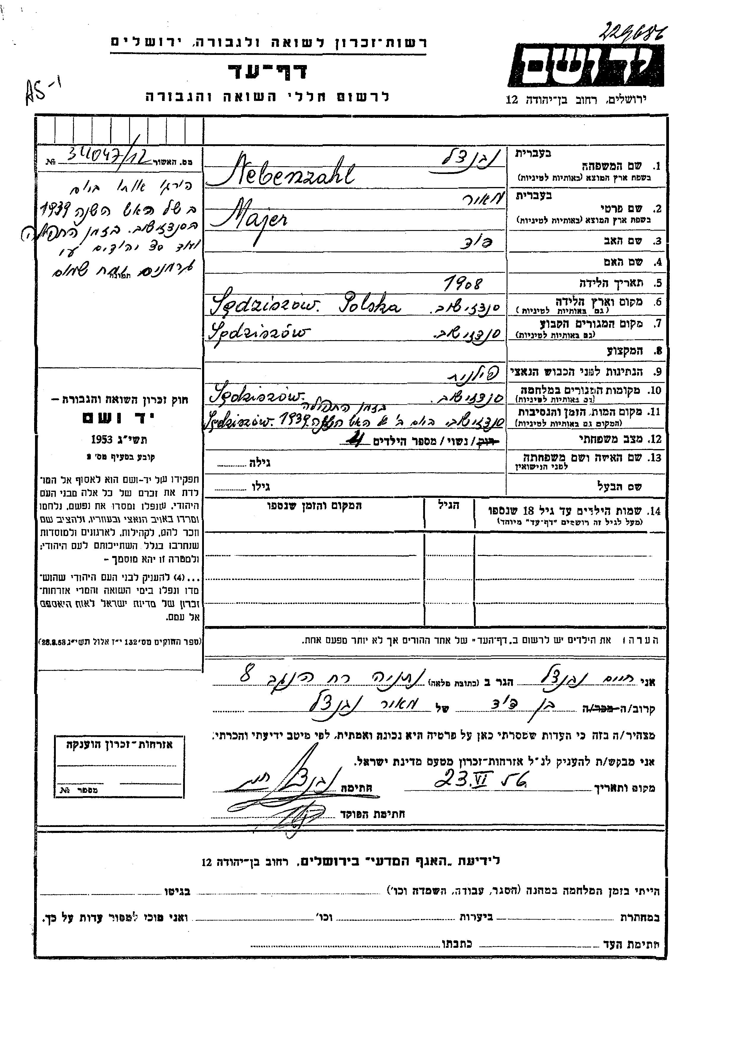 Majer Nebenzahl was born in Sedziszow Malopolski, Poland, 1908 to David. He was married. Prior to WWII he lived in Sedziszow Malopolski, Poland. During the war he was in Sedziszow Malopolski, Poland. Majer was murdered in the Shoah. Place of death: Sedziszow Malopolski, Poland, 1939.