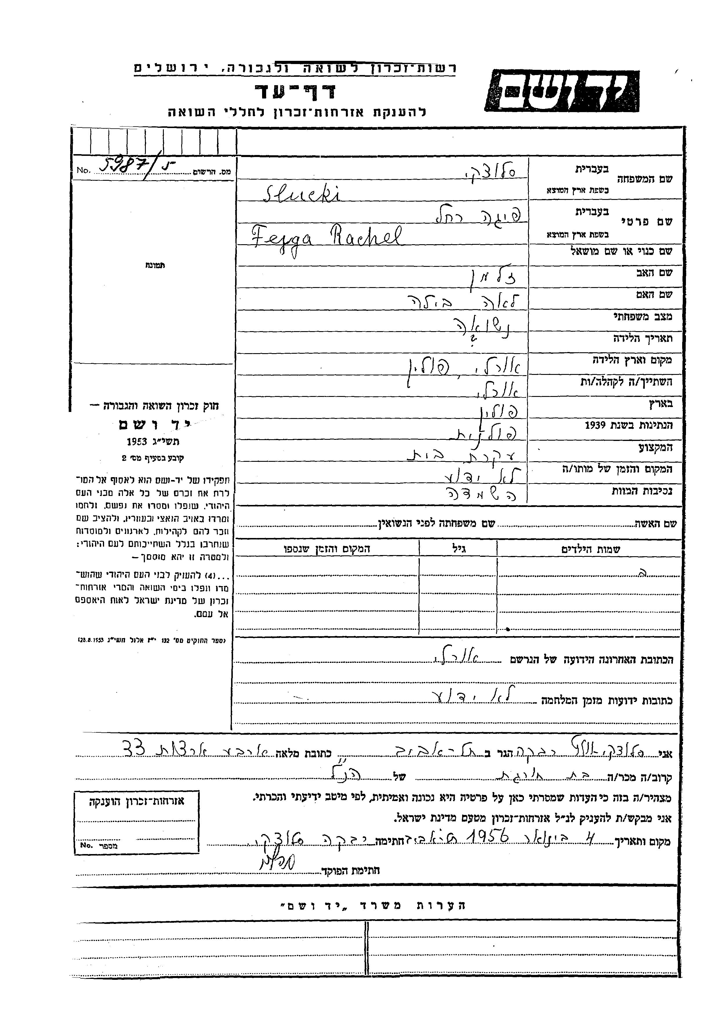 Fejga Rachel Slucki was born in Orly, Poland to Zalman and Lea Bila. She was a housewife and married. Prior to WWII she lived in Orly, Poland. Fejga Rachel was murdered in the Shoah.