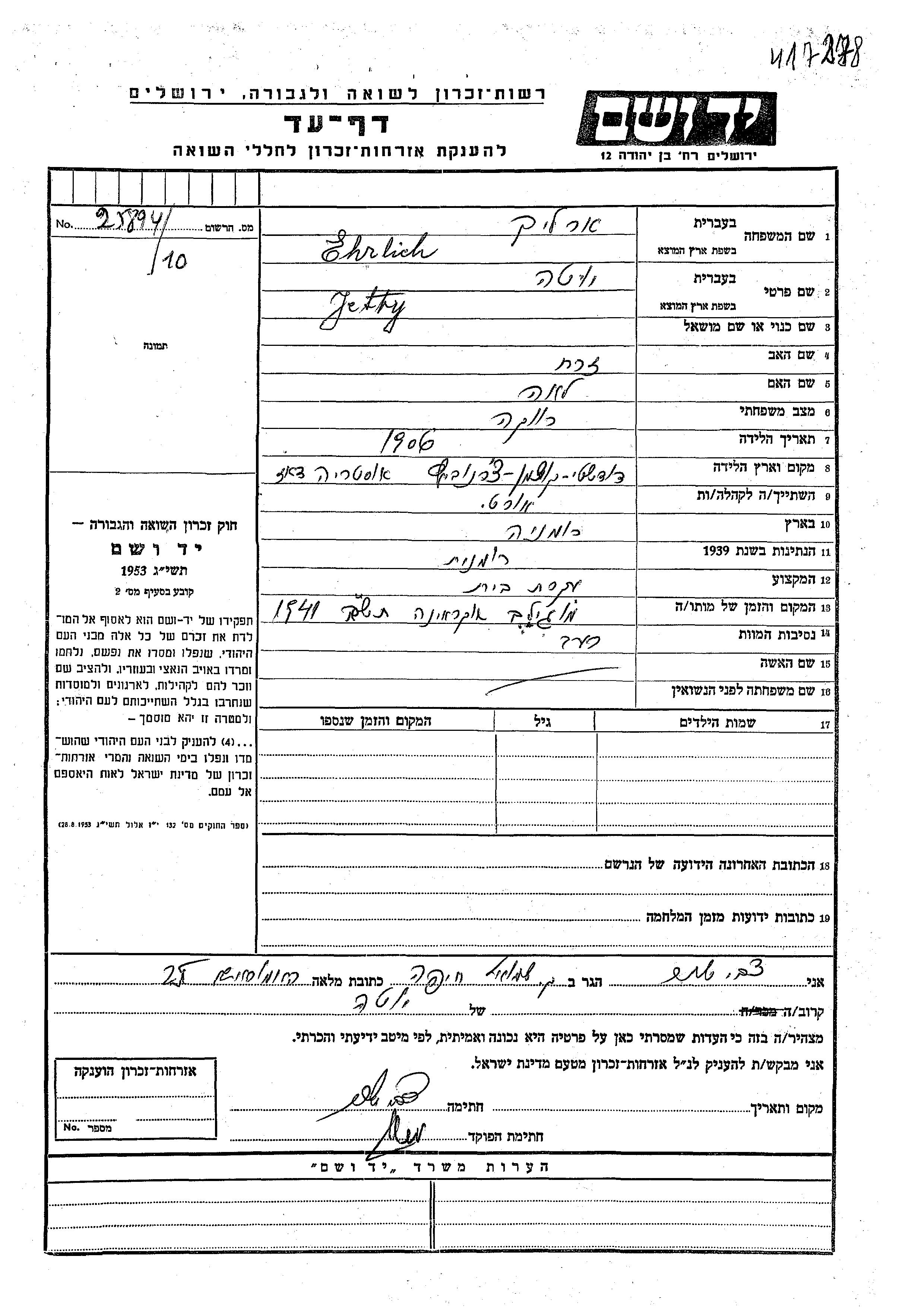 Jetty Ehrlich was born, 1906 to Zerakh and Lea. She was a housewife.