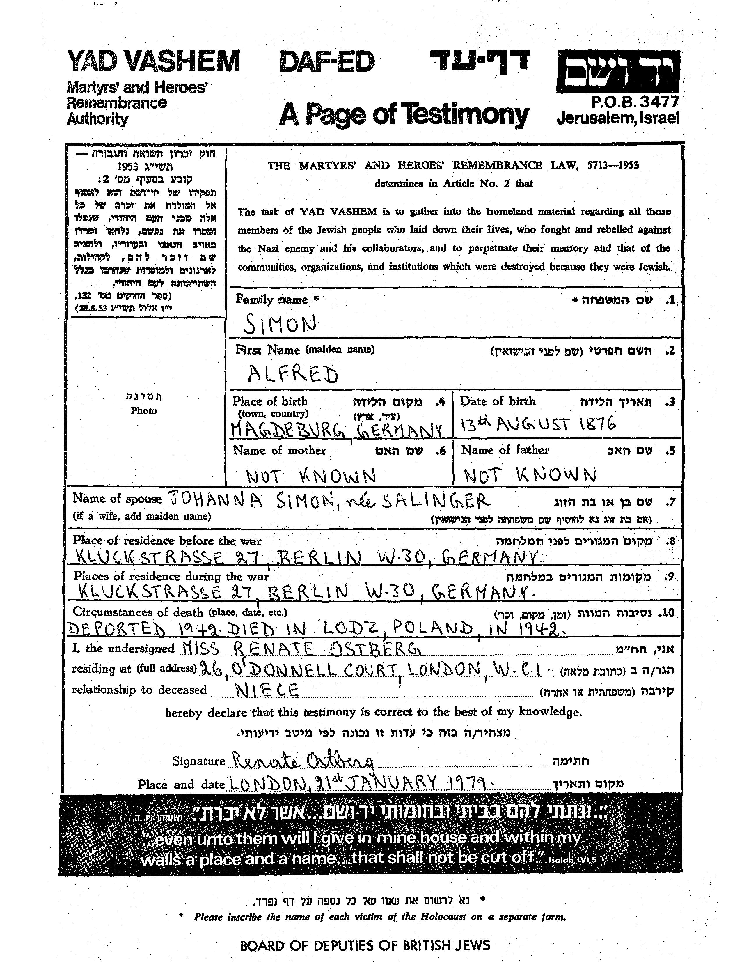Simon Alfred 1876 Berlin, Germany Page of Testimony