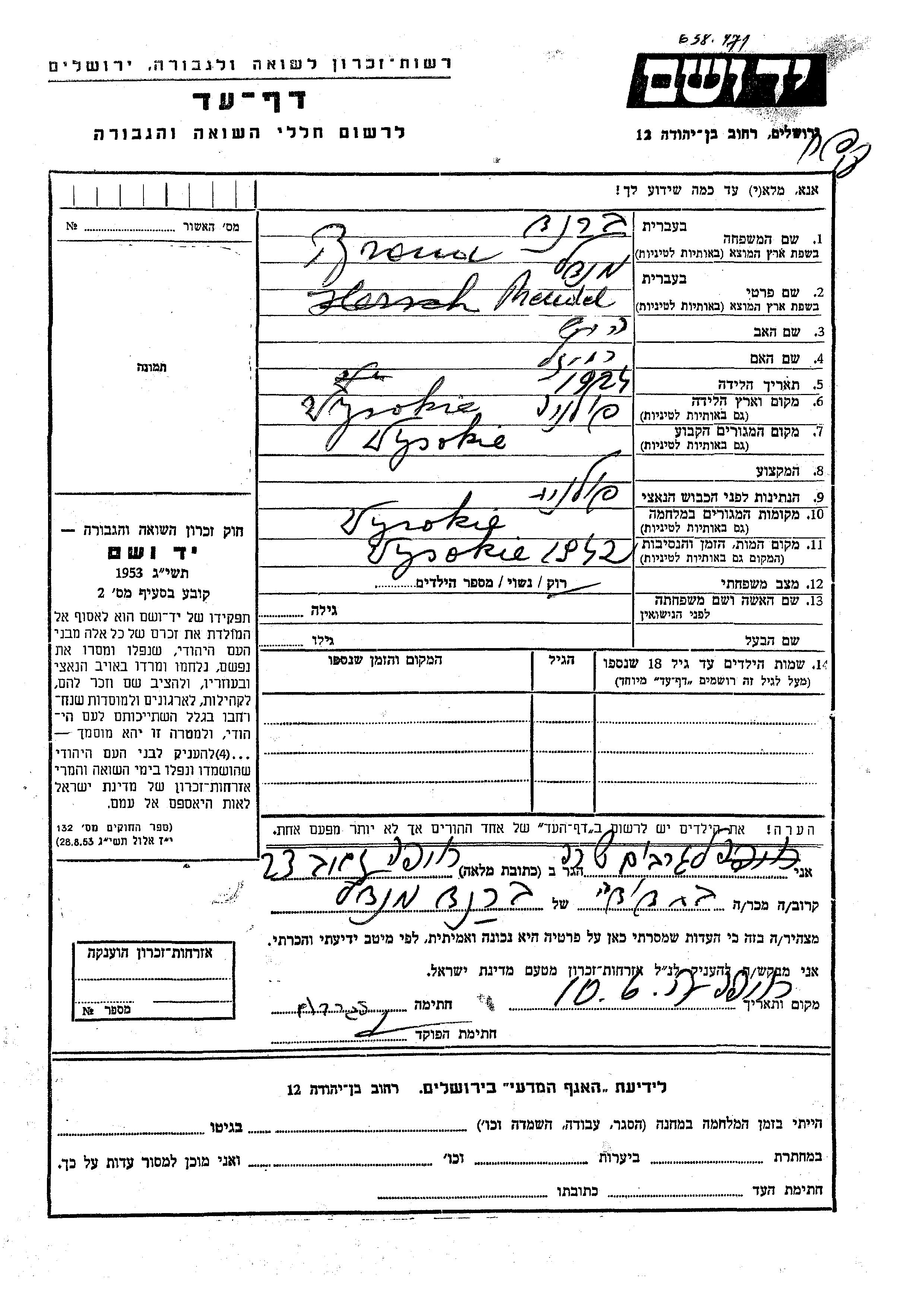 Brand Herch Mendel 1924 Wysokie, Poland Page of Testimony