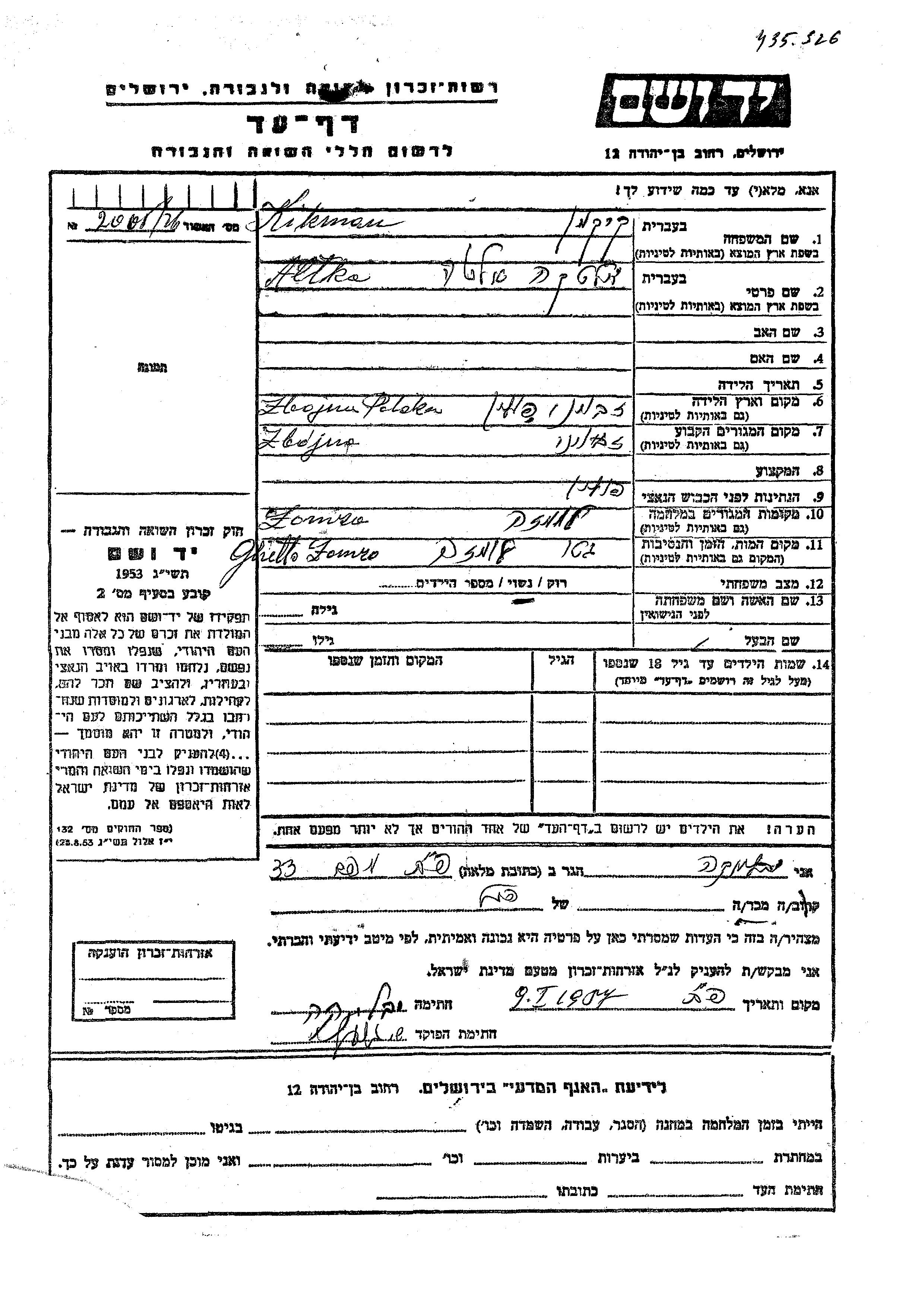 Altka Kikman was born in Zbojna, Poland. She was married. Prior to WWII she lived in Zbojna, Poland. During the war she was in Łomża, Poland. Altka was murdered in the Shoah. Place of death: Łomża, Poland.