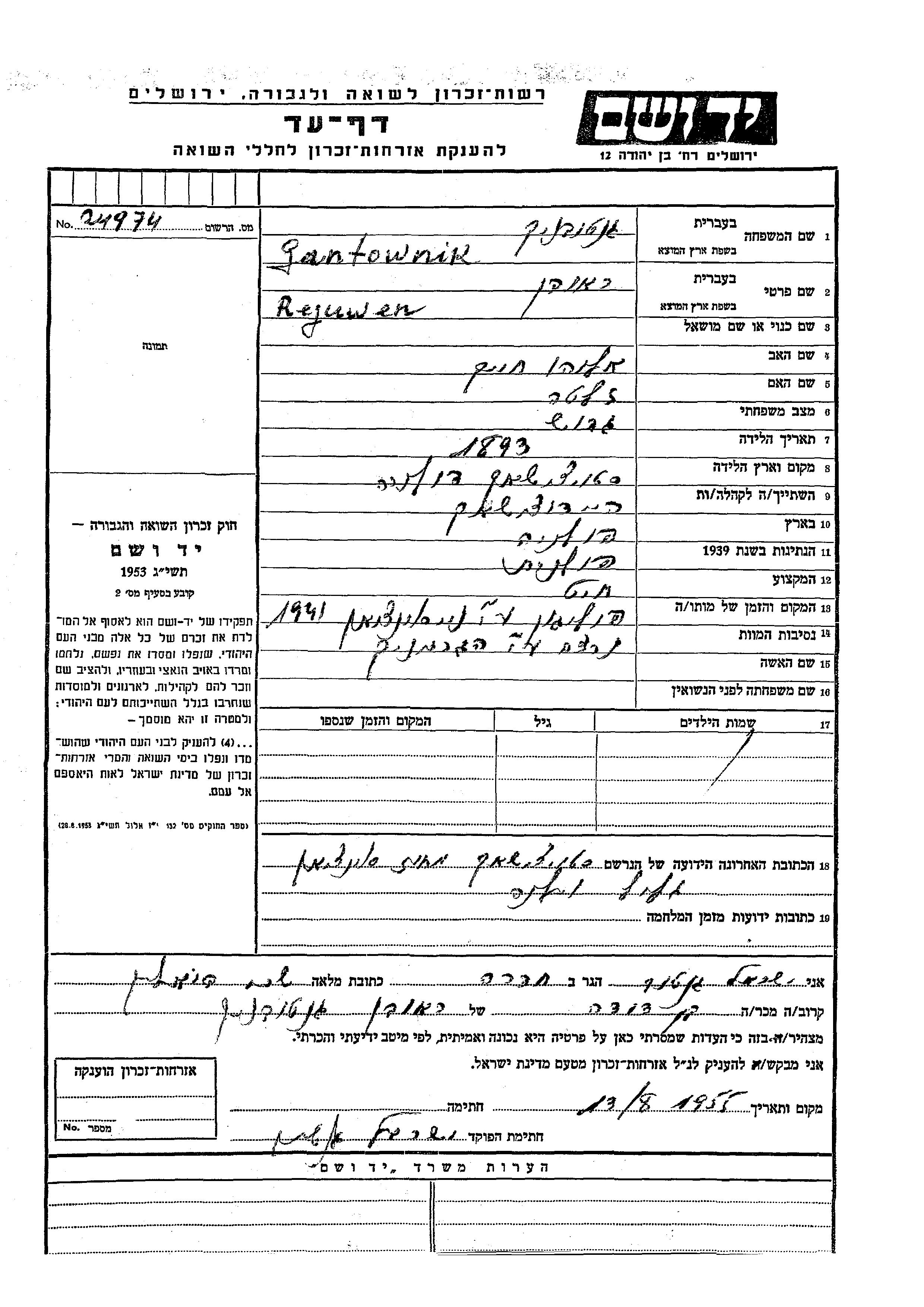 Rejuwen Gantownik was born in Stojaciszki, Poland, 1893 to Eliahu Khaim and Zlata. He was a tailor and divorced. Prior to WWII he lived in Stojaciszki, Poland. Rejuwen was murdered in the Shoah. Place of death: Polygon, Murder Site, 1941.