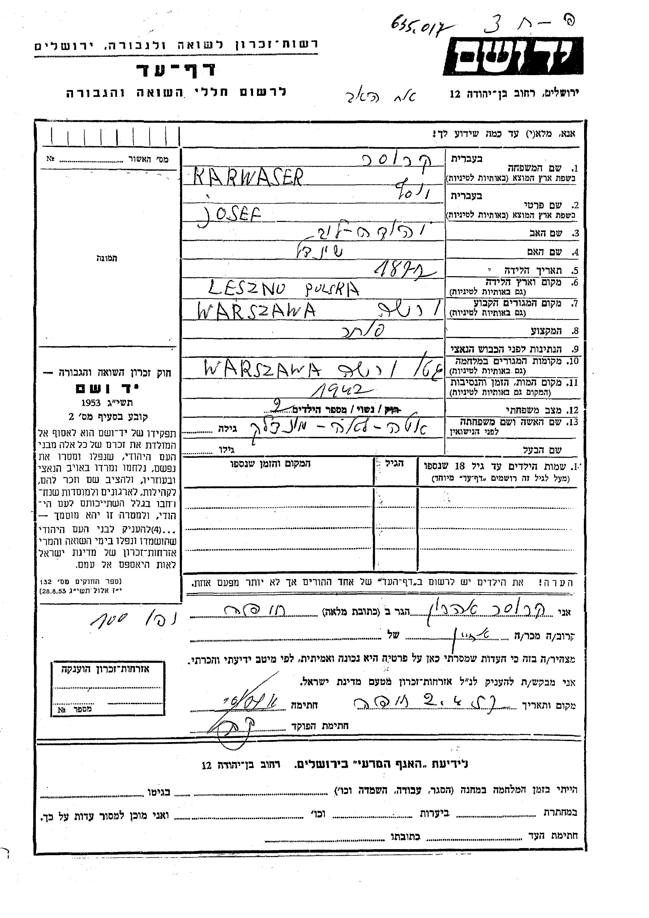 Josef Karwaser was born in Leszno, Poland, 1872 to Yehuda Leib and Sheindl. He was a merchant and married to Eta Lea nee Mondlak. Prior to WWII he lived in Warszawa, Poland. During the war he was in Warszawa, Poland. Josef was murdered in the Shoah. Place of death: unknown, 1942.