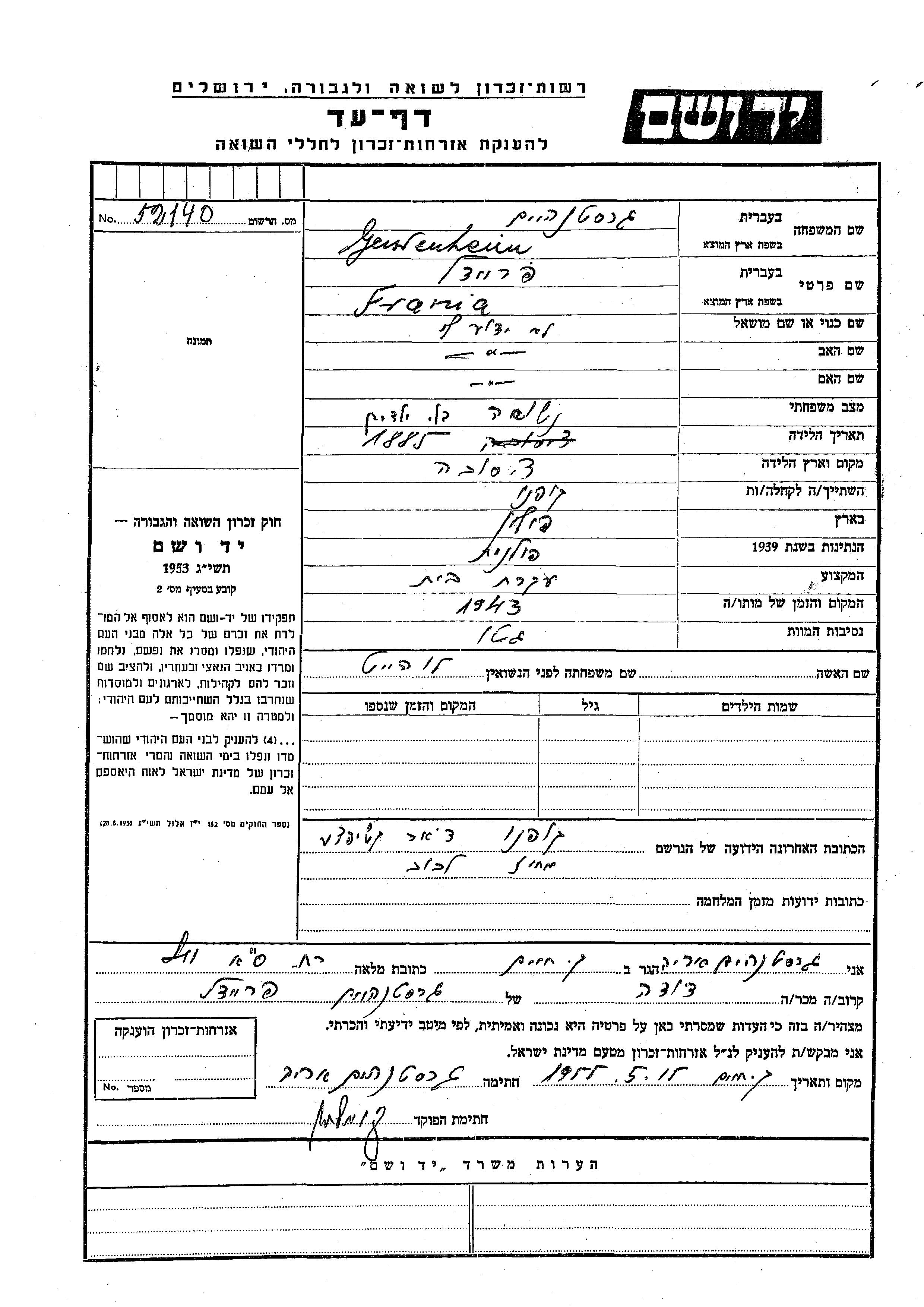 Frania Freidel Gerstenheim nee Loheit was born in Cisowa, Poland, 1885. She was a housewife and married. Prior to WWII she lived in Kupna, Poland. During the war she was in Kupna, Poland. Frania Freidel was murdered in the Shoah. Place of death: Ghetto, Poland, 1943.
