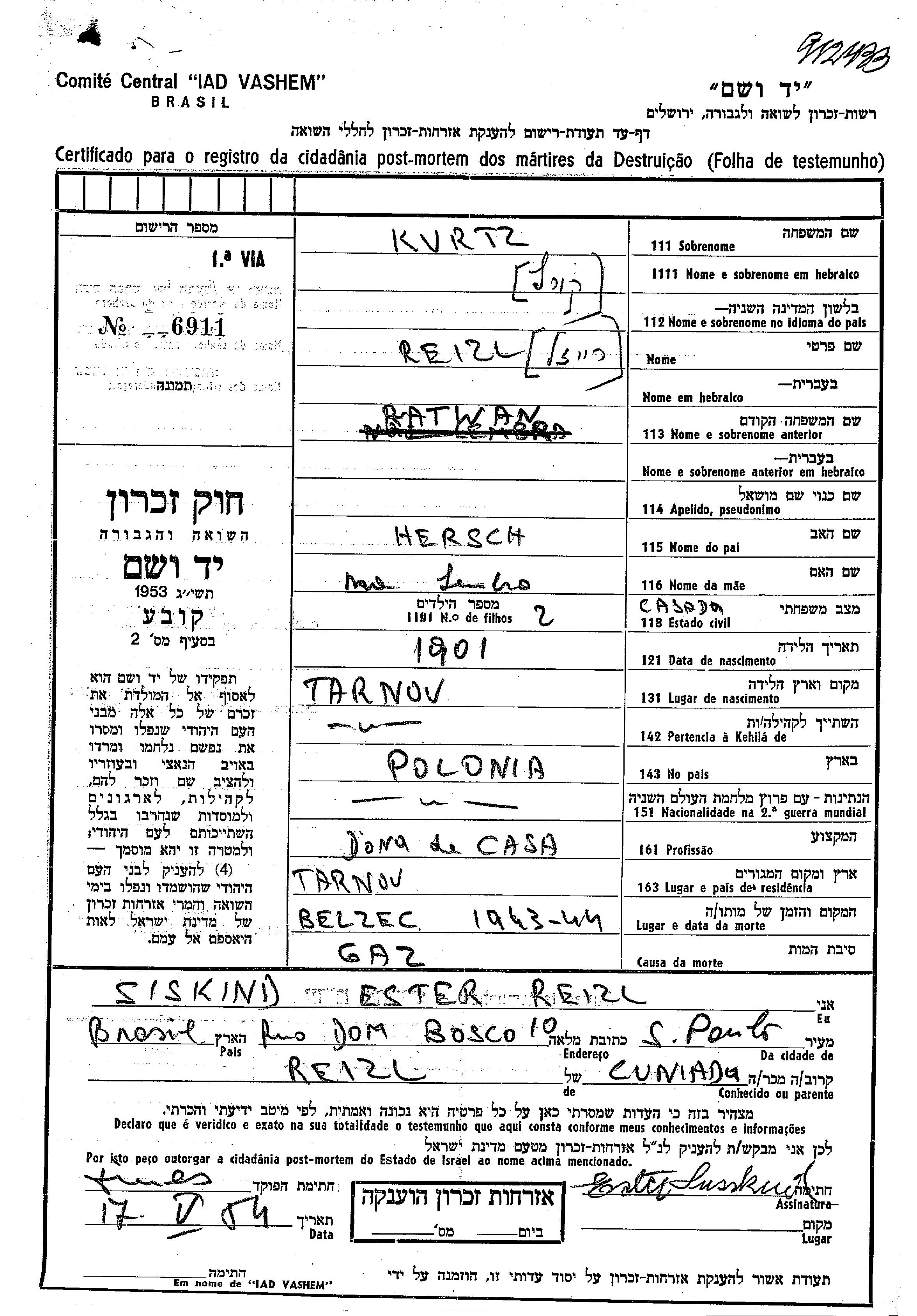 Yad Vashem - Pages of Testimony Names Memorial Collection