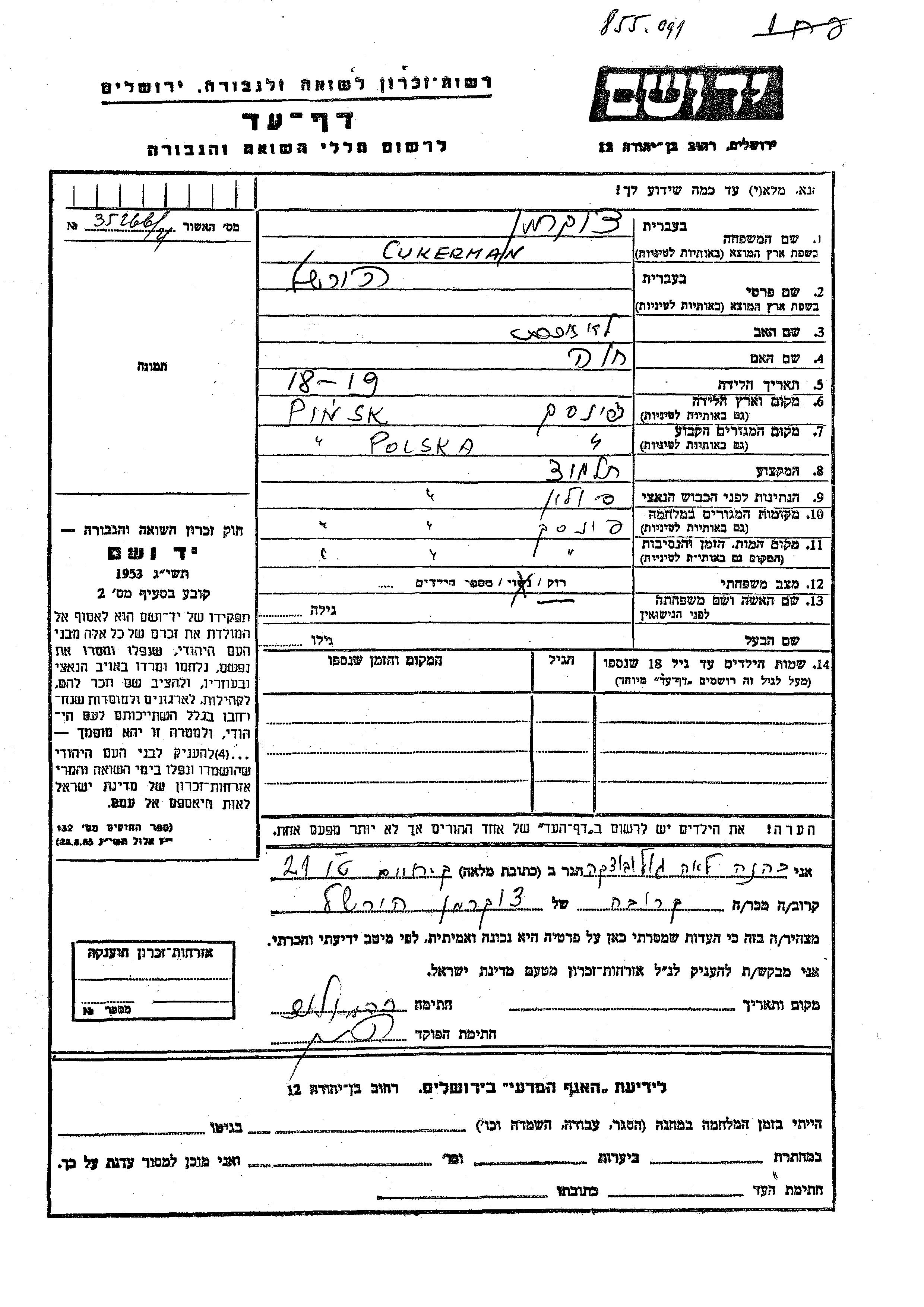 Cukerman Hirshel Pinsk, Poland Page of Testimony