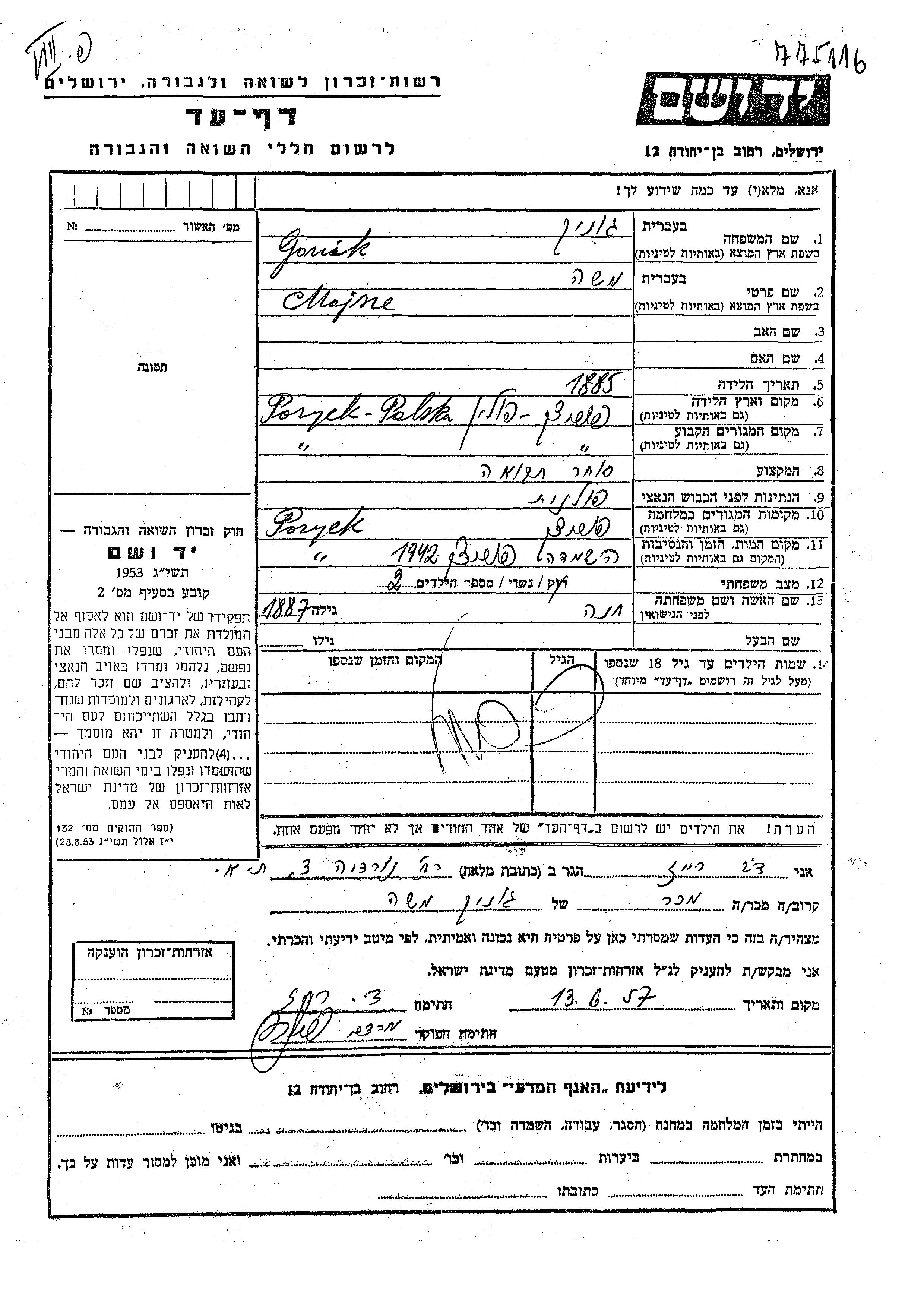 Gonik Mojne Moshe 1885 Poryck, Poland Page of Testimony