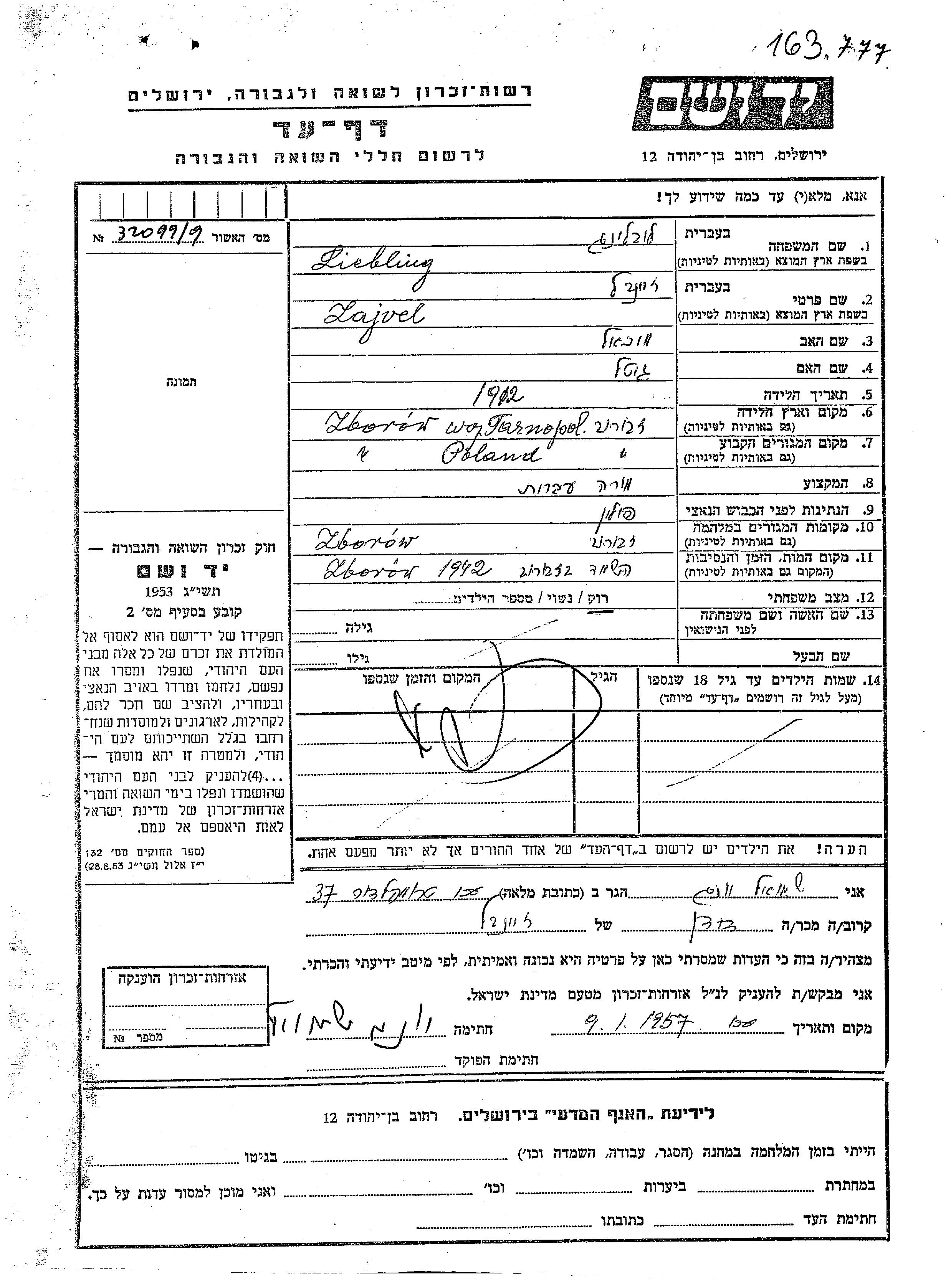 Lubling Zajvel 1912 Zborow, Poland Page of Testimony