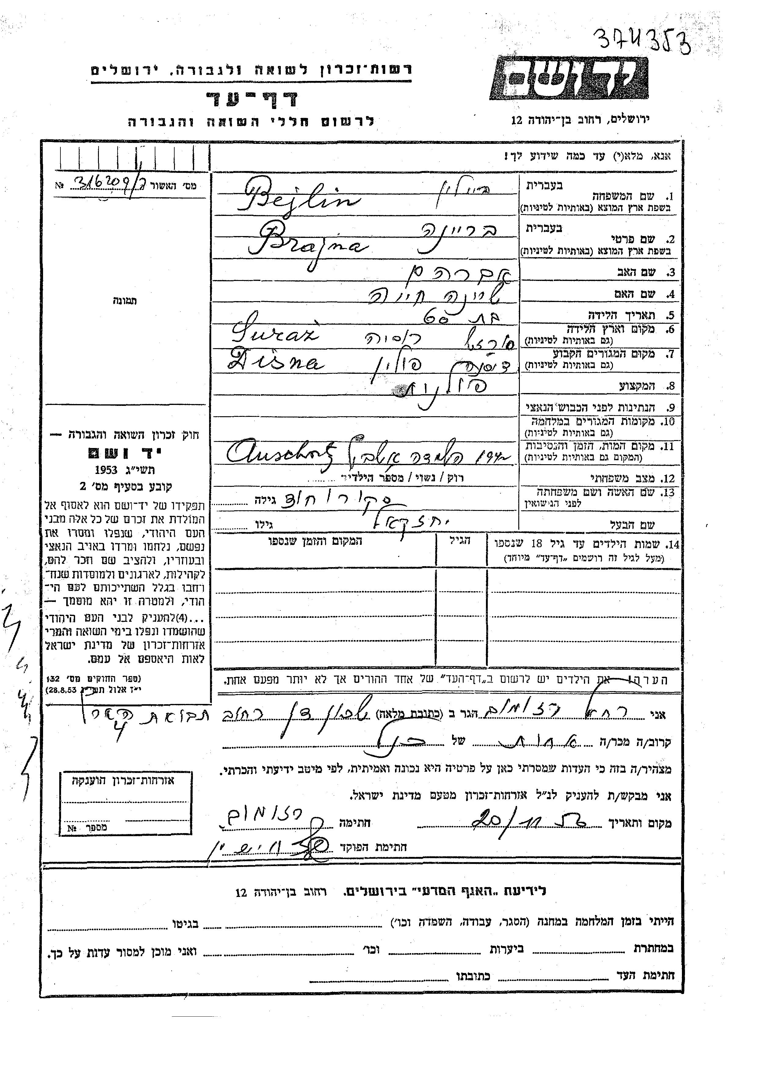 Brajna Bejlin nee Skorokhod was born in Suraz, Poland to Avraham and Sheina Khaia. She was married to Yekhezkel. Prior to WWII she lived in Disna, Poland. Brajna was murdered in the Shoah. Place of death: Auschwitz, Poland.